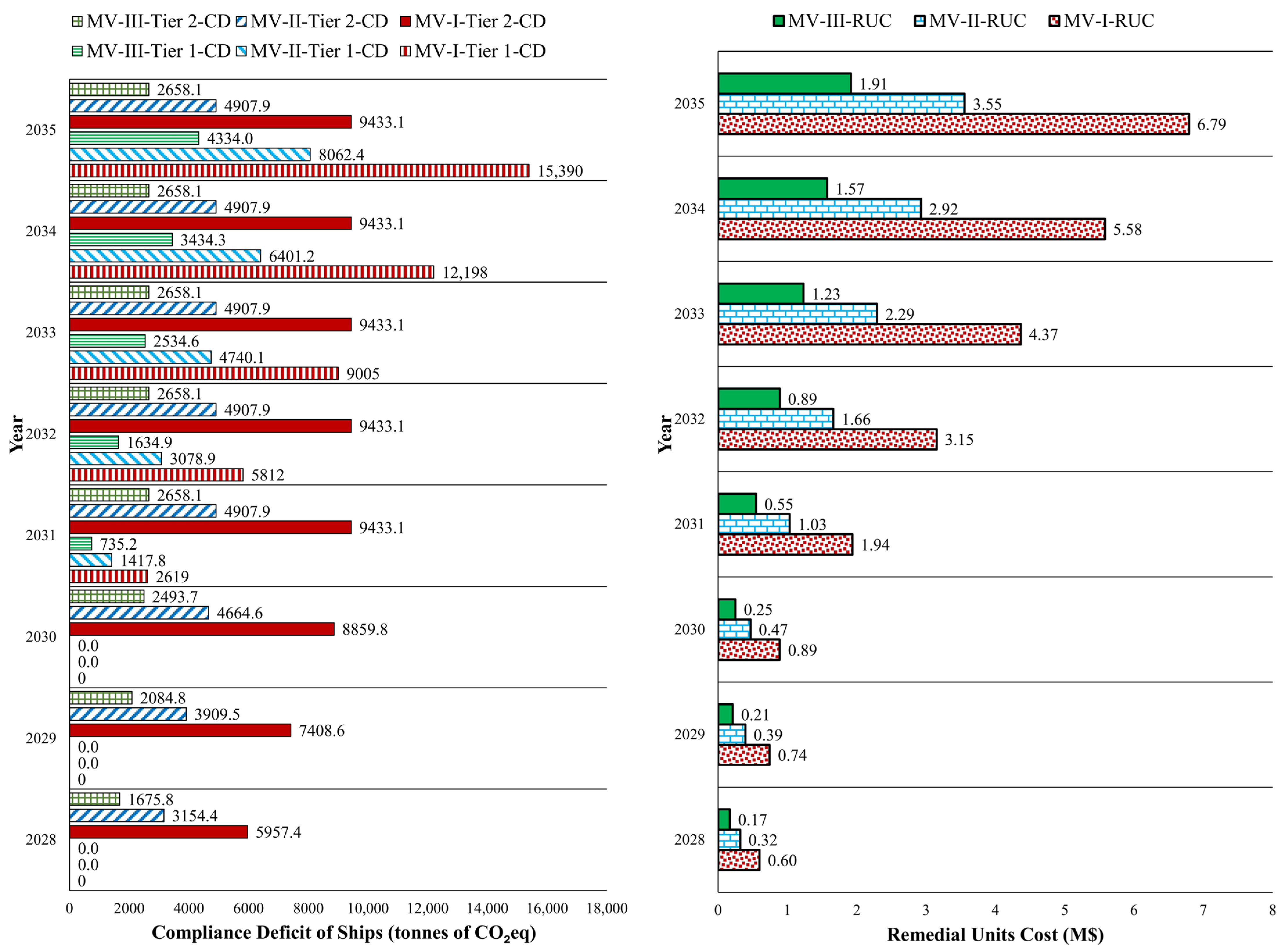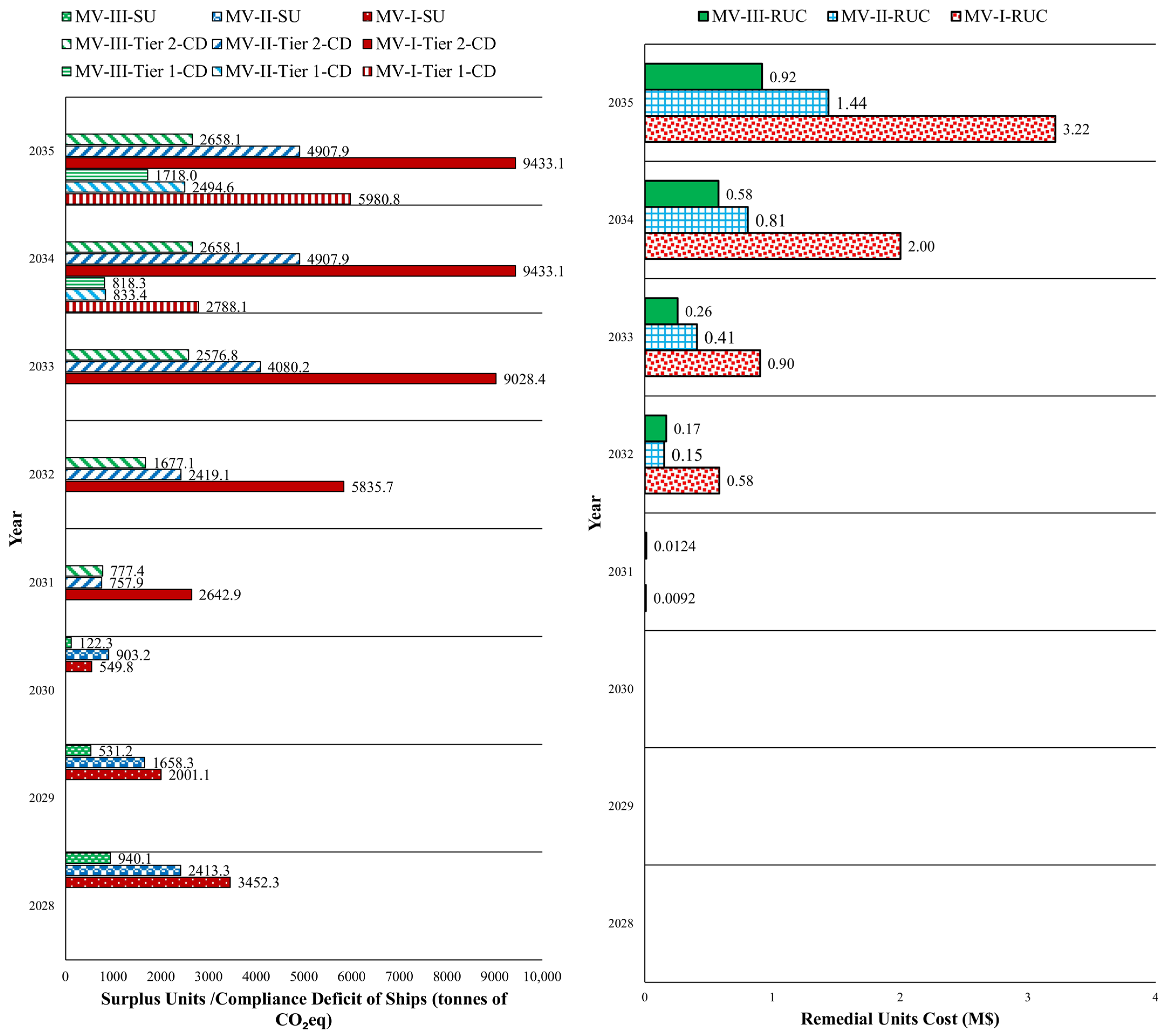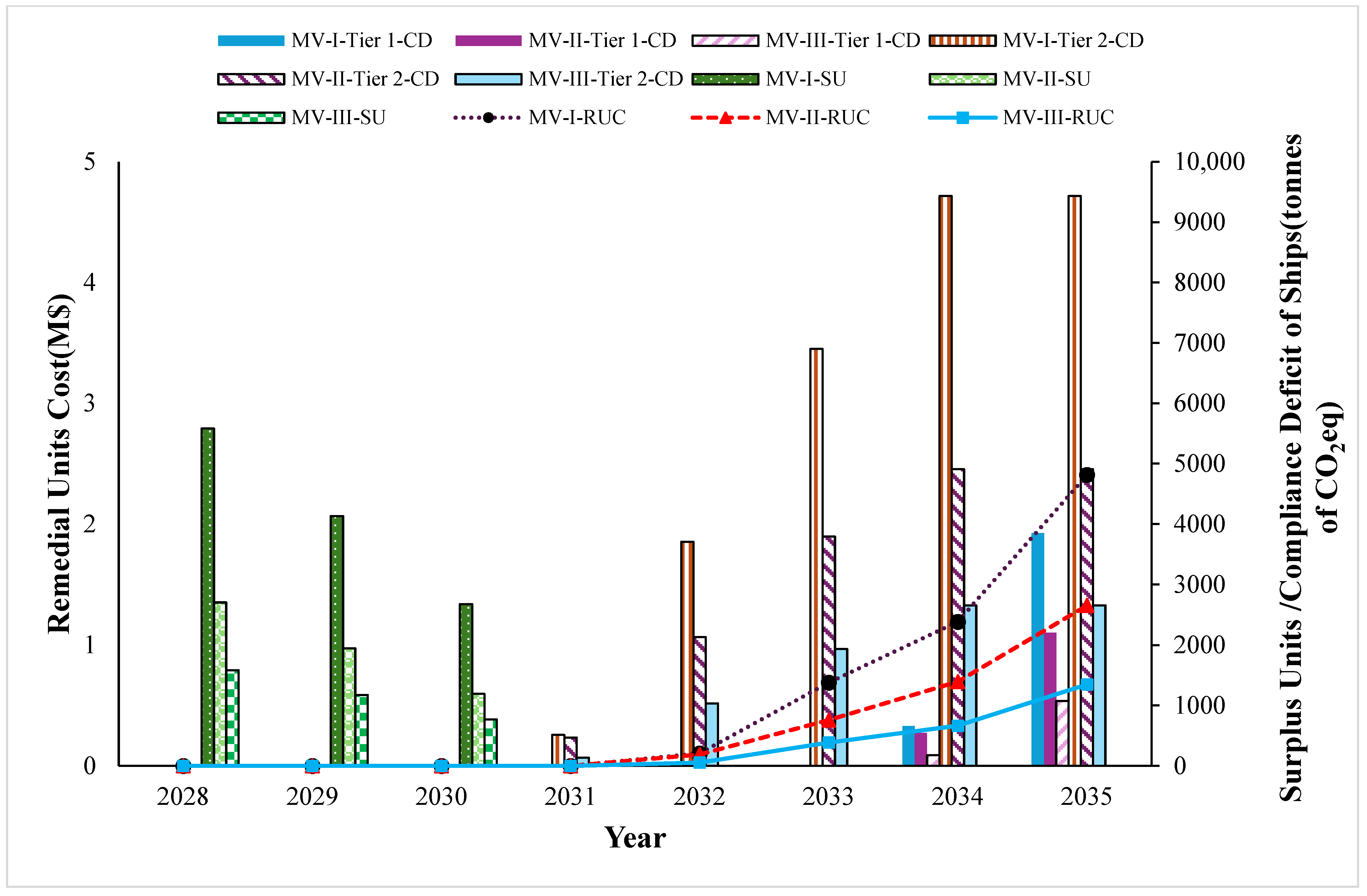 3 (2), a substantial compliance deficit emerges, contrasting sharply with the scenario where significant surplus units are gained. By the end of the 2035 reporting period, the costs of the ships’ remedial units are estimated at USD 16.6 million, USD 8.5 million, and USD 4.7 million, respectively. Within the regulatory framework,
