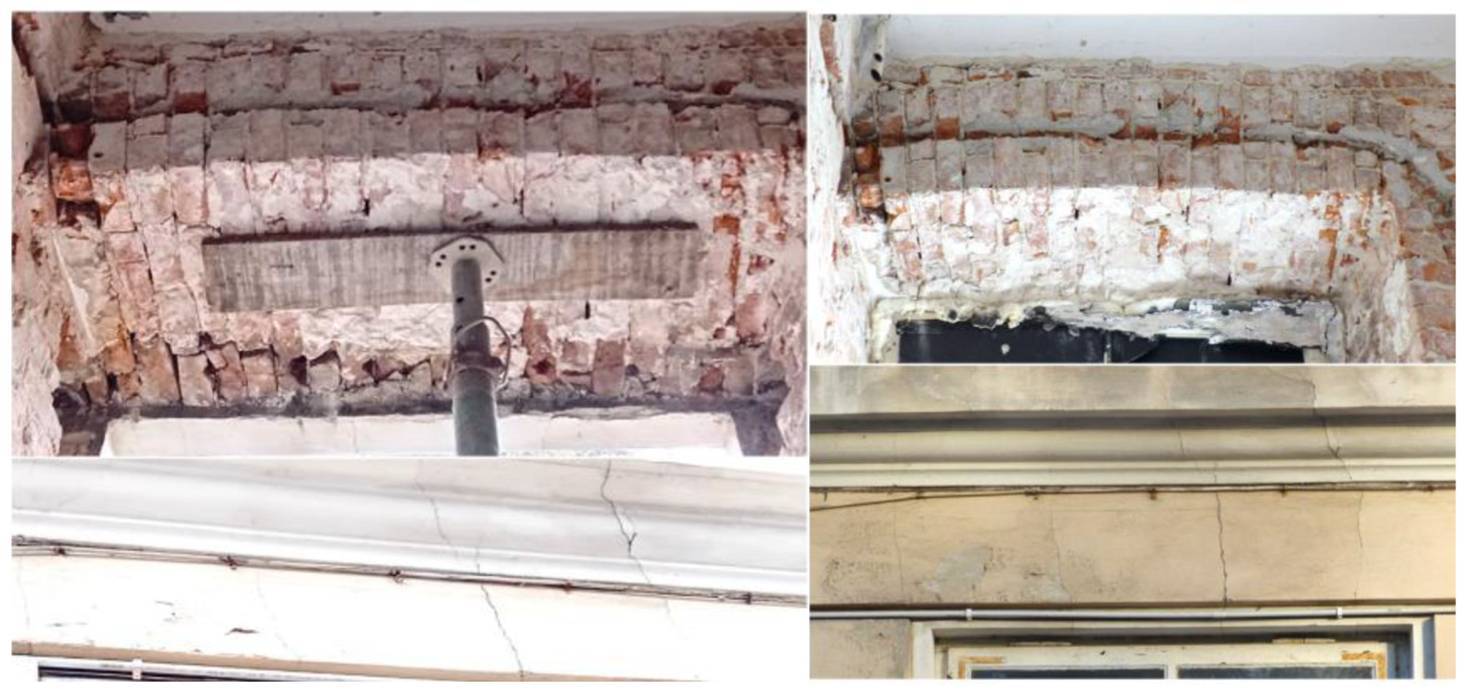 The results of re-testing the walls of building No. 1 were as follows: the compressive strength of the bricks in the above-ground walls ranges from 10.9 to 35.5 MPa, while that of the mortar ranges from 0.2 to 2.6 MPa; the compressive strength of the wall ranges from 1.5 to 4.7 MPa. Taking into account a coefficient of 0.8, the characteristic compressive strength of the walls ranges from 1.2 to 3.8 MPa. Therefore, it is concluded that the external walls have very low strength parameters due to the low strength of the lime mortar. The above-mentioned defects led to the decision to construct new lintels using the monolithic reinforced concrete method.