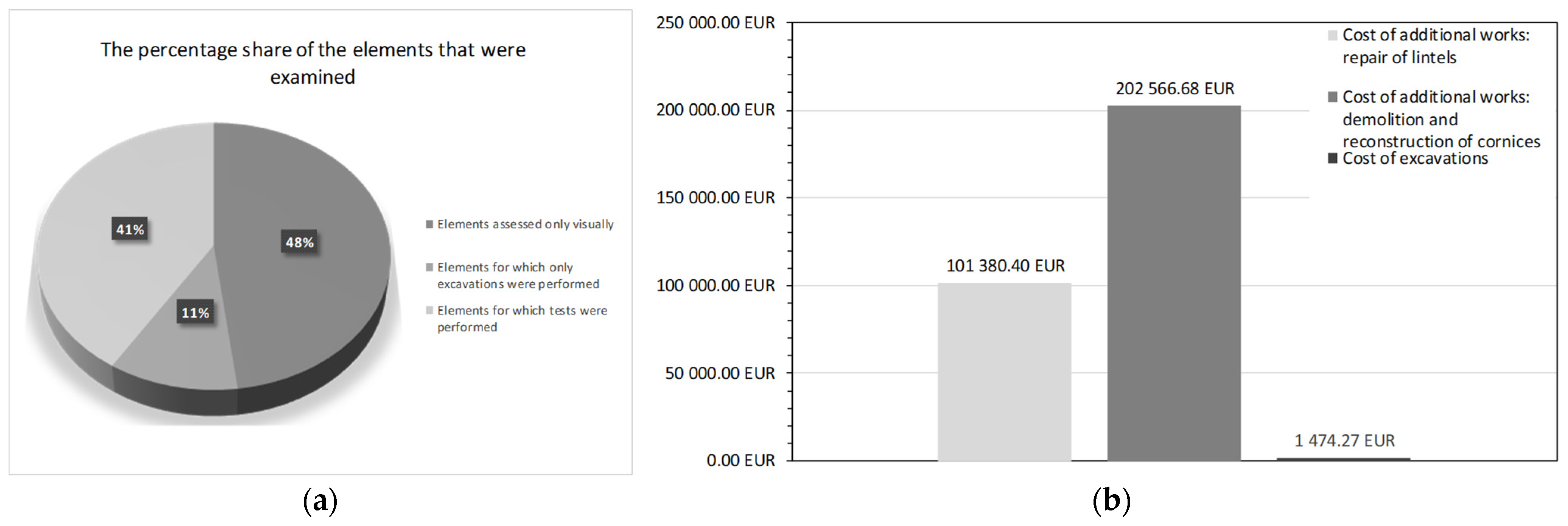 The pie chart on the left indicates that 48% of the examined structural elements were assessed solely through visual inspection, 11% were subjected to surface-level testing only, and 41% received a full diagnostic investigation. This means that more than half of all elements were not evaluated using comprehensive diagnostic procedures. In this context, “insufficiently assessed” refers to cases where either no diagnostic tests were performed (missing data) or the tests conducted did not meet the recommended scope defined in WTA and EN 350:2016. Such omissions significantly increase the likelihood of overlooking hidden structural defects. The bar chart on the right depicts the correlation between the breadth of testing and the costs of construction work. The expense for excavations was only EUR 1474.27, while additional works, including the repair of lintels and the reconstruction of cornices, amounted to EUR 101,380.40 and EUR 202,566.68, respectively. The results are consistent with existing research in preventive conservation and underscore the importance of early diagnostics in the physical safeguarding of heritage materials. Besides that, such diagnostics make conservation projects more financially attractive [