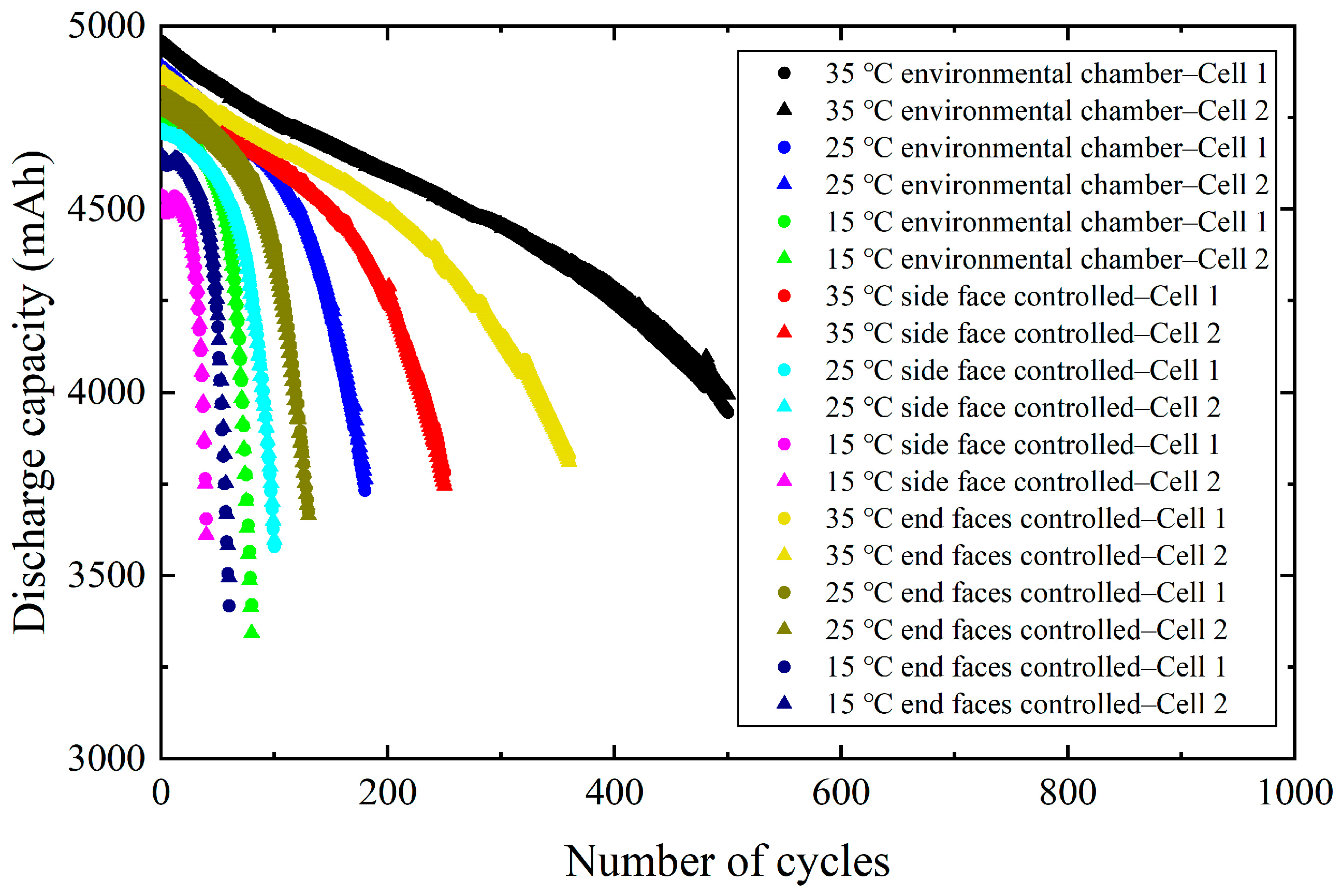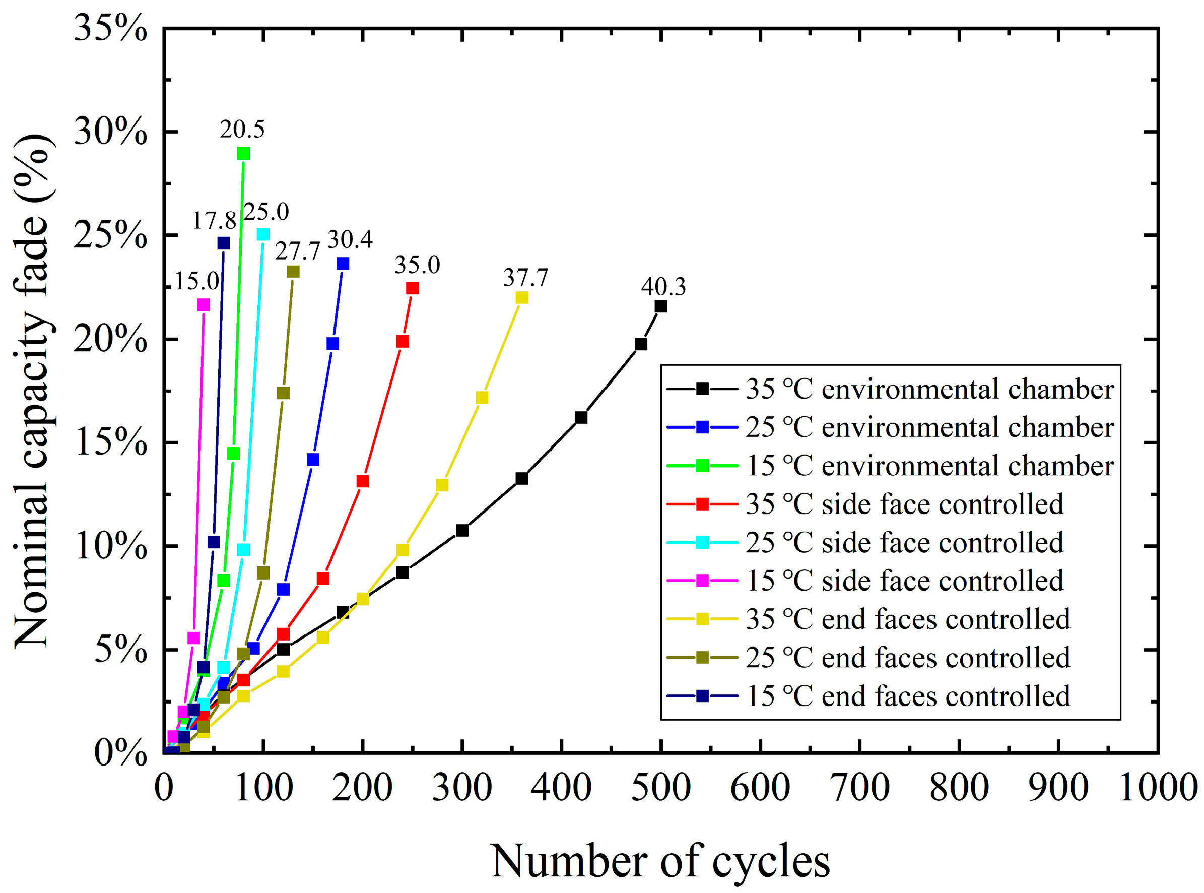 - Experimental data of the 21700 cylindrical batteries show that the lower the CTAT, the fewer the number of available cycles within the temperature range of this study.