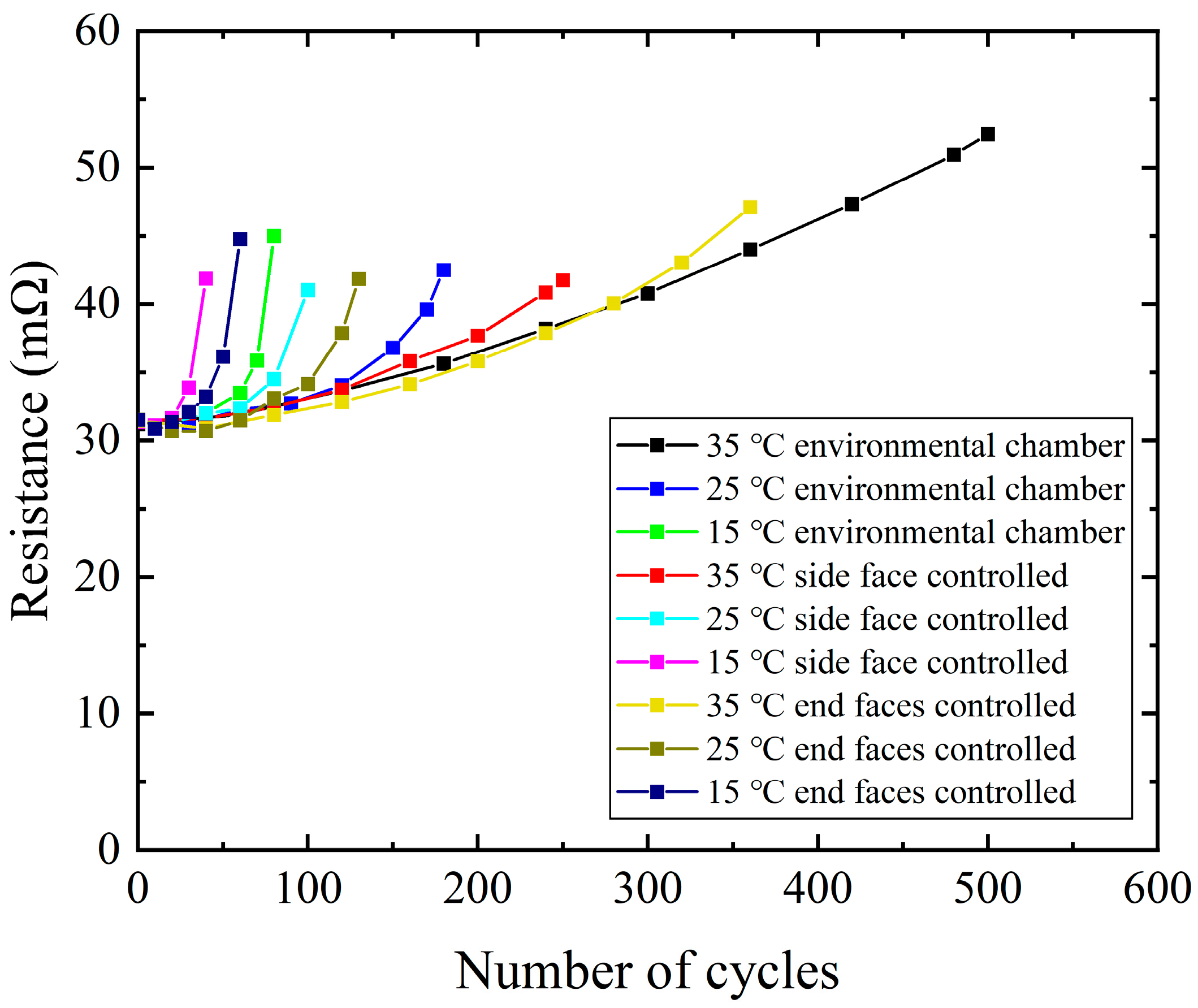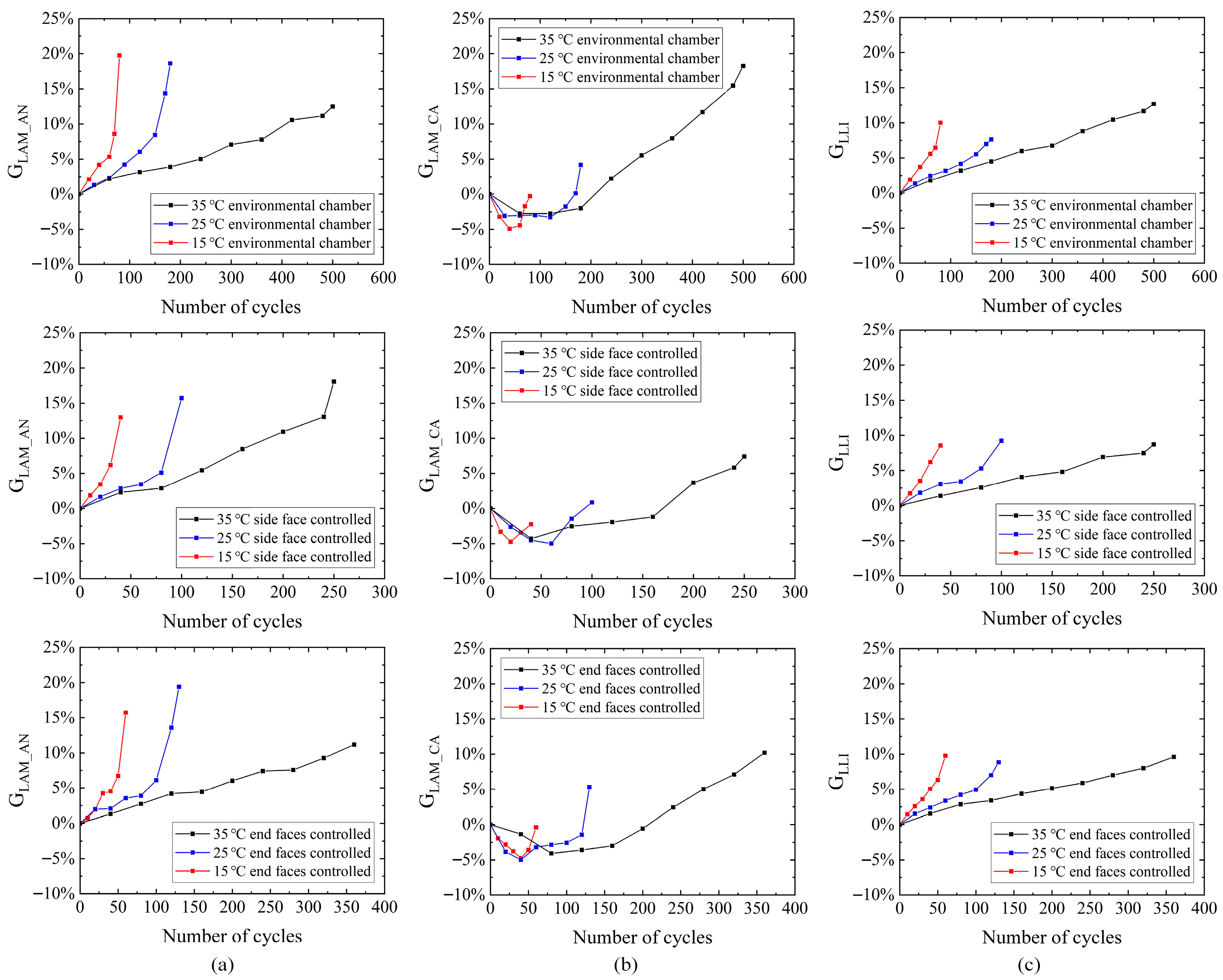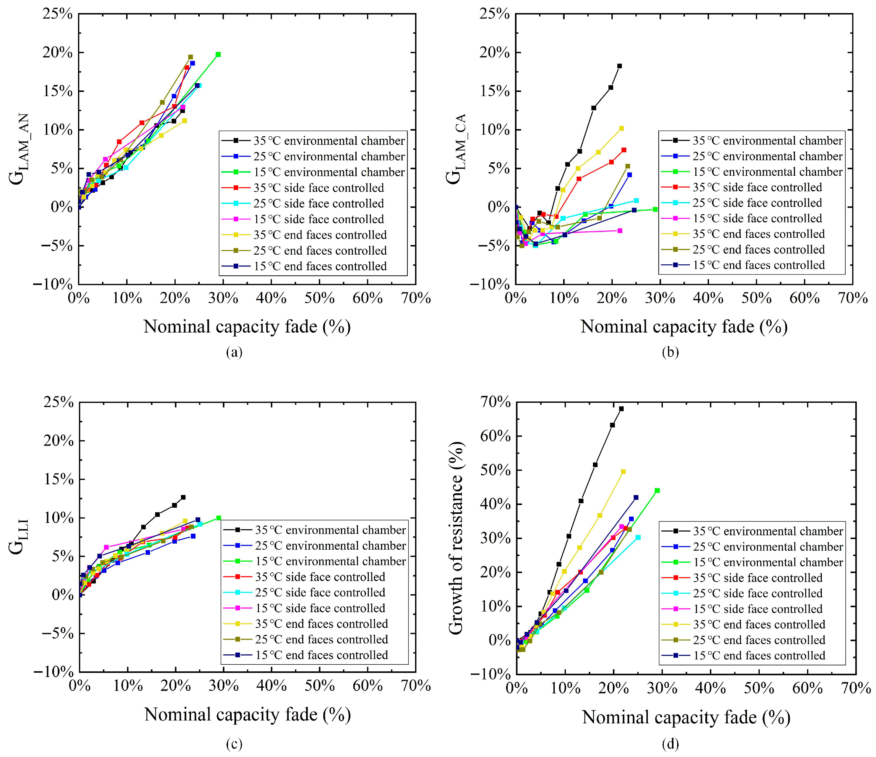 - The loss rate of lithium inventory of most test groups is approximately 10% after the battery aging tests, which directly impacts the reduction in the battery’s nominal capacity. The internal resistance growth rate can exceed 50% at the end of the battery’s life.
