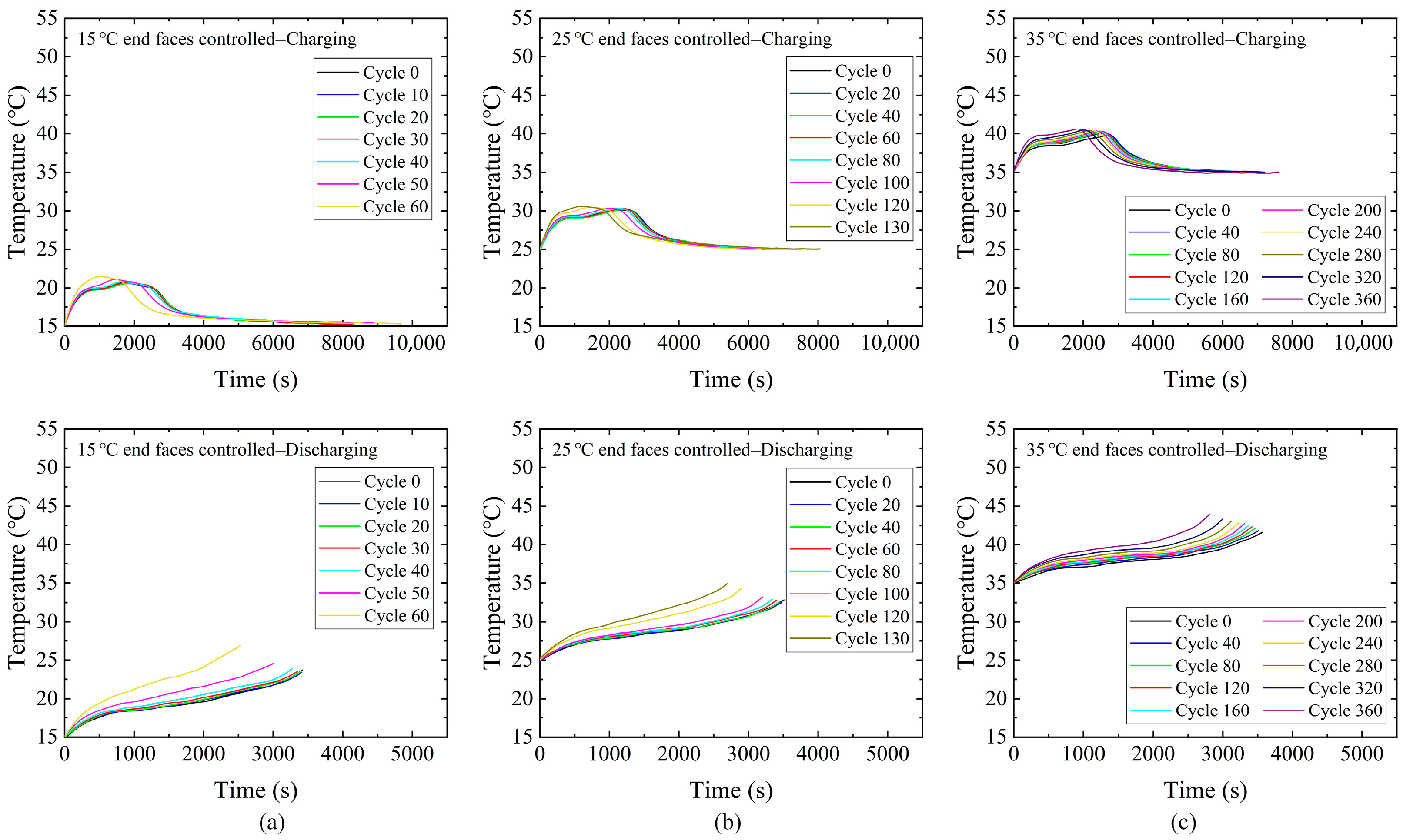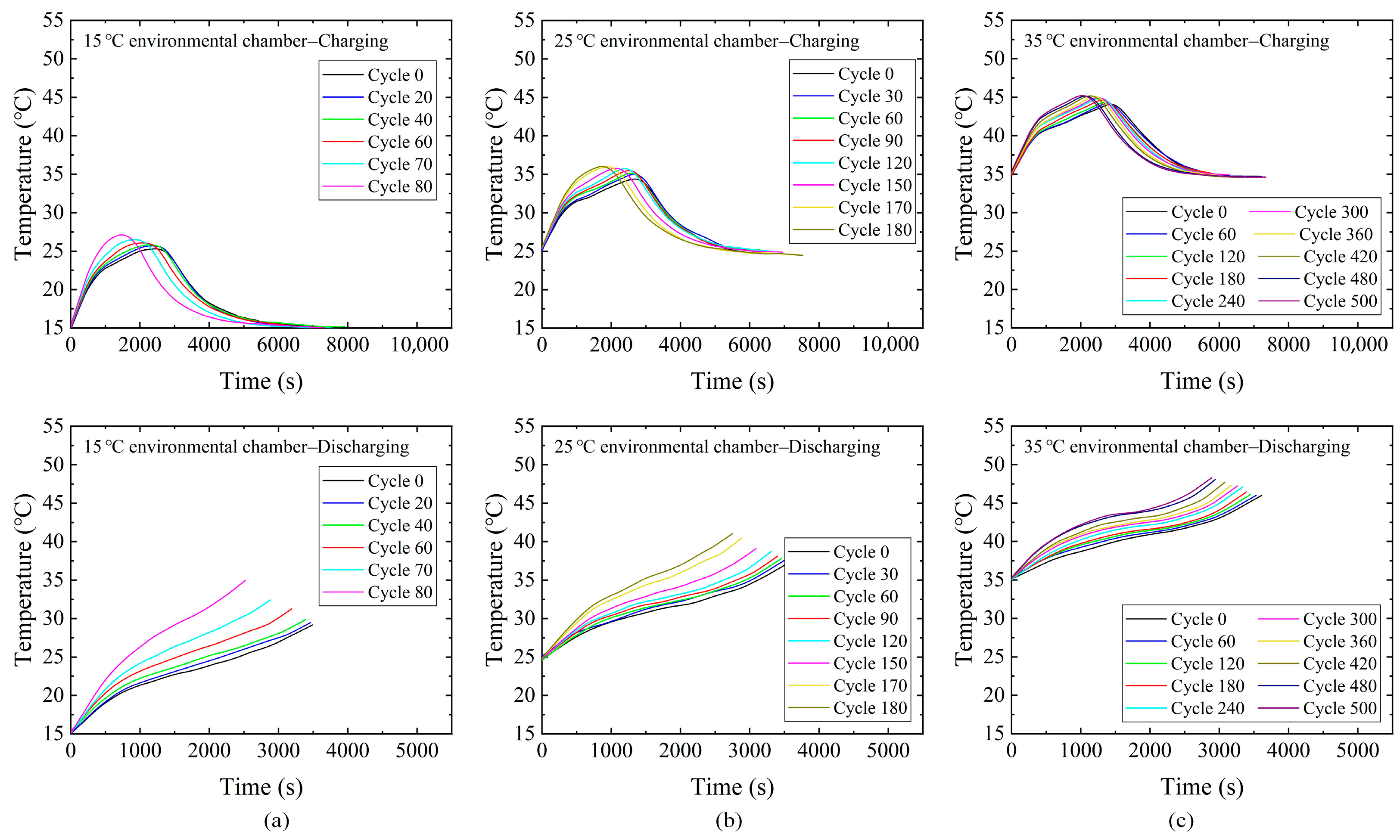 3.3. Temperature Results of Batteries During Cycle Aging Process