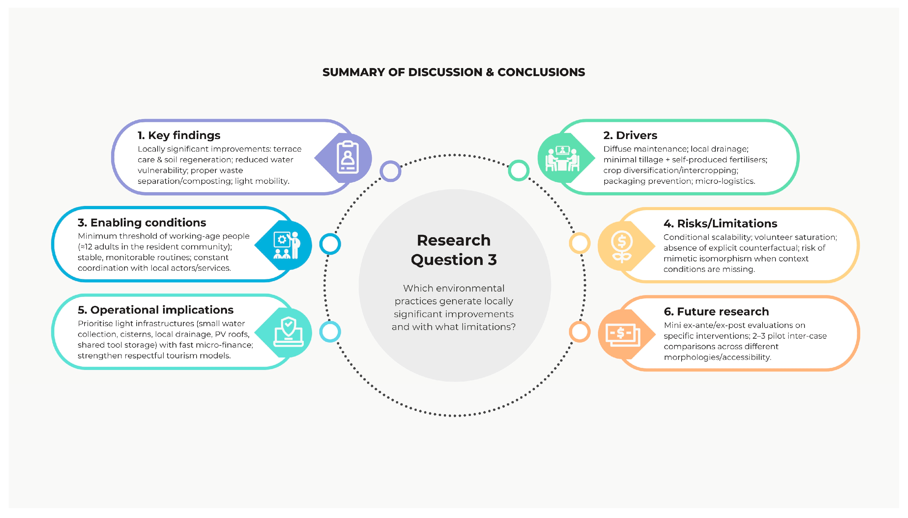 | Terraced-landscape upkeep & local drainage | Preventive cleaning of canals; drystone wall repair; pre-rainfall checks; micro-drainage fixes. | Weekly routines; sufficient active participants; role rotation & handover notes; simple checklists; coordination with municipality for heavy works. | Seasonal labour peaks; reliance on key individuals; storm damage exceeding local capacity; safety/training needs. |