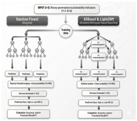 In this study, the classification pipeline ingests firm-level binary governance/sustainability indicators from period t − 1 (Yes = 1, No = 0) as inputs and aims to predict the RoE class (high vs. low) at period t Random Forest aggregates parallel trees by majority voting/averaging, whereas XGBoost and LightGBM build trees sequentially via additive updates to minimize a regularized loss. Each model produces the class probability P (High RoE), which, unless otherwise stated, is mapped to a predicted class using a decision threshold . Performance is evaluated on a held-out test set (30%) using Accuracy, macro-Precision/Recall, macro-F1. The process is depicted in Figure 1.