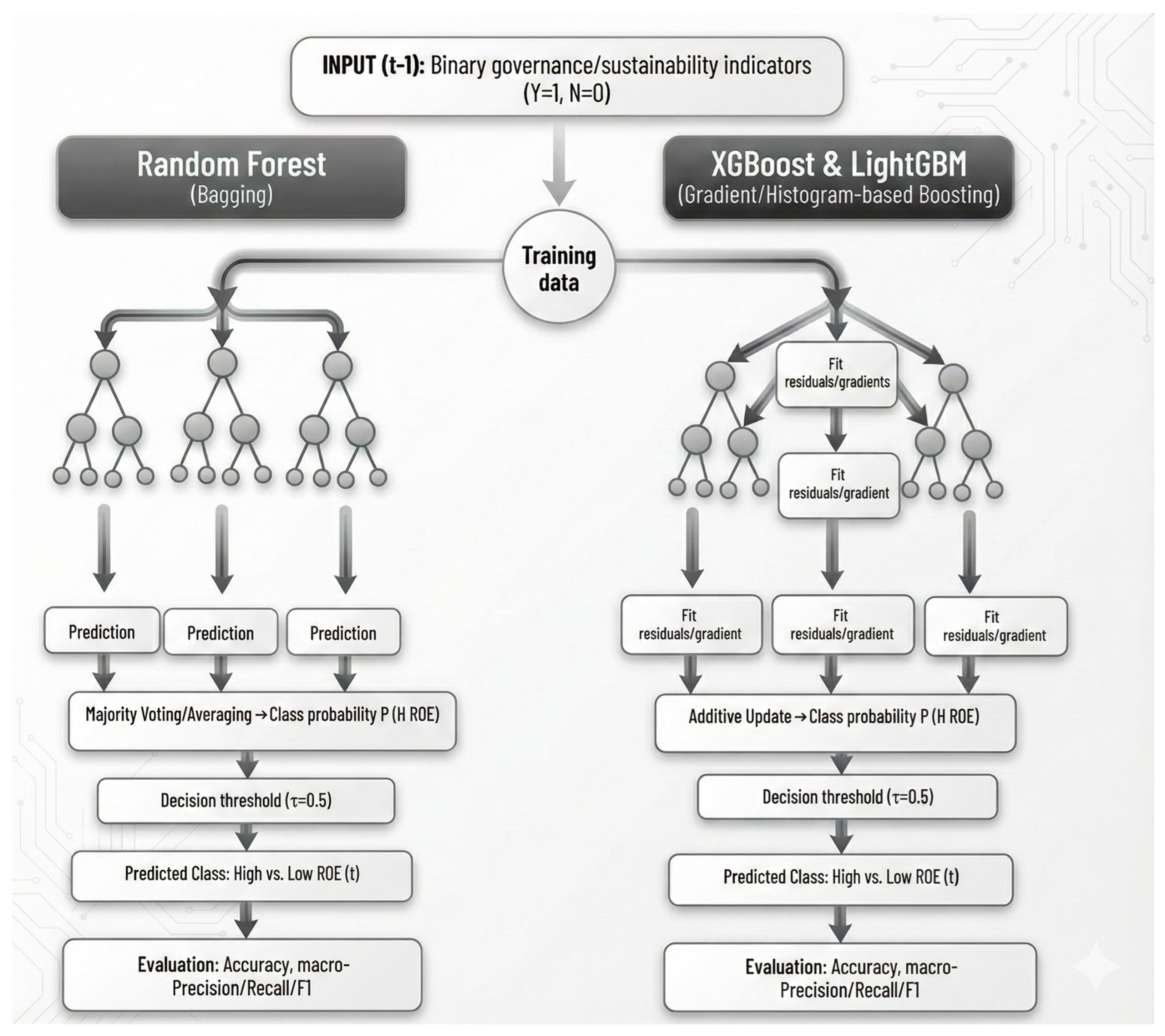 Figure 1. Classification workflows for Random Forest, XGBoost, and LightGBM (BIST; RoE H/L; binary governance/sustainability indicators; 70% train/30% test).