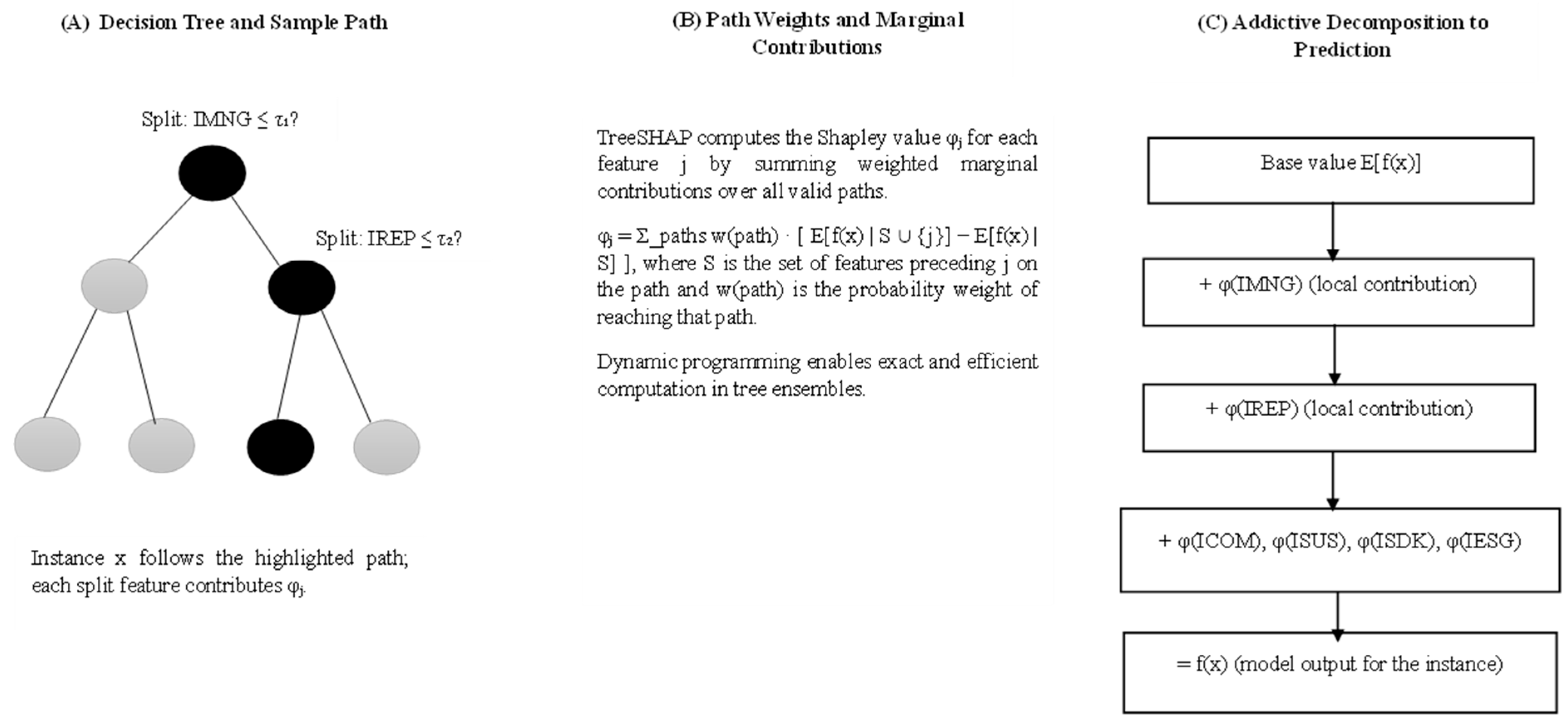 Figure 2. How TreeSHAP operates in tree ensembles: an IMNG-based example.