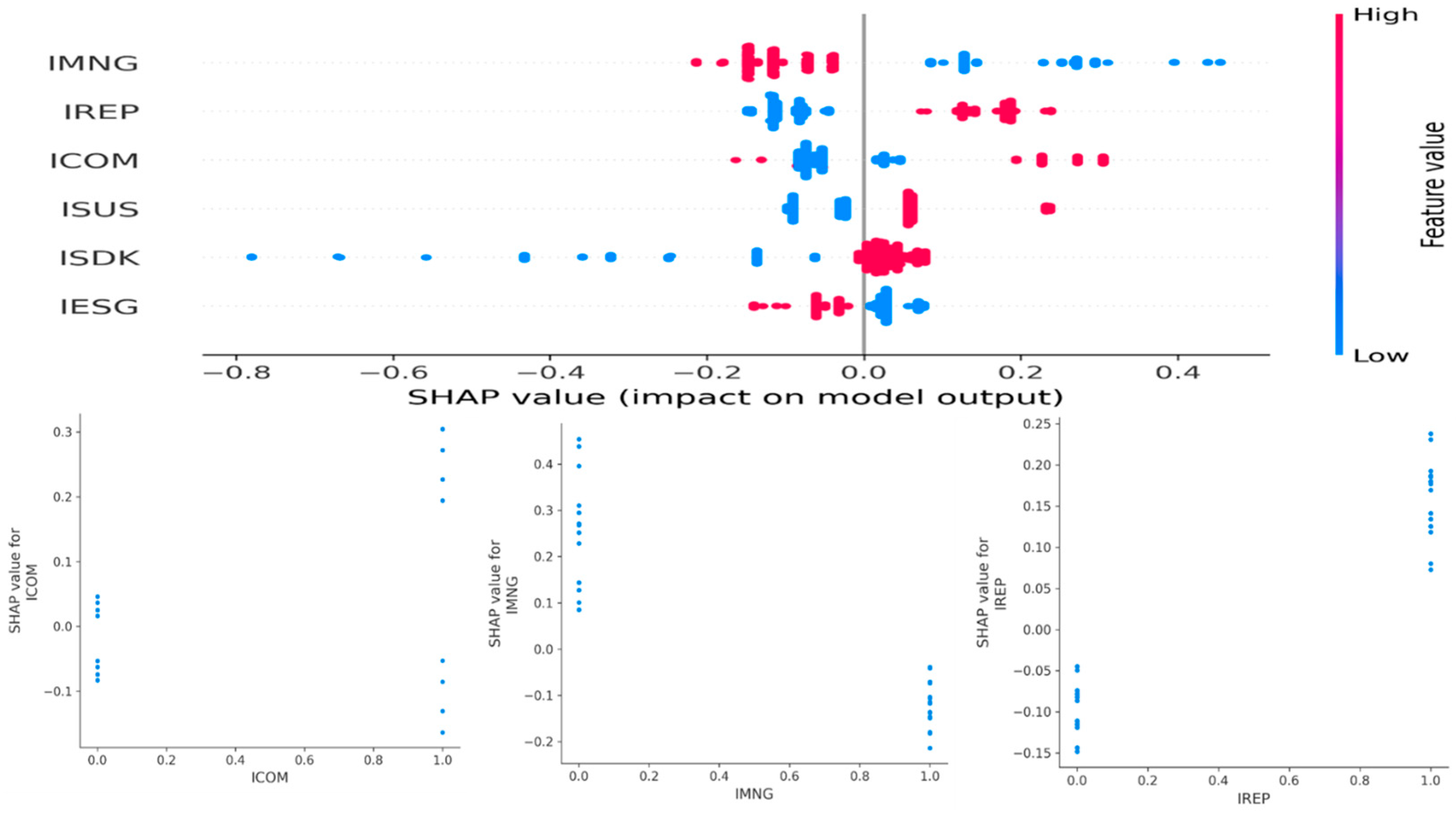 Figure 3. SHAP beeswarm plot and dependency plots for the ICOM, IMNG, and IREP variables.