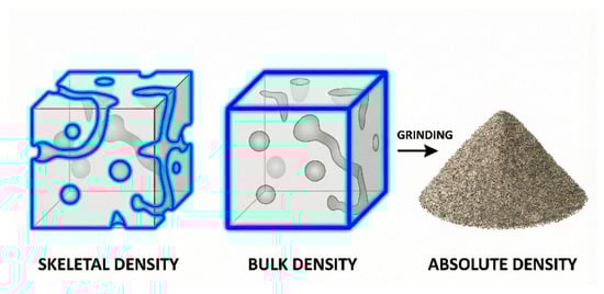 Traditional construction materials are characterized by numerous properties which can be classified as physical, mechanical, chemical, and performance related. The fundamental classification of construction materials is based on physical parameters including density, water absorption, and porosity [9,10]. Knowledge of these parameters is essential for assessing the performance of the material with respect to its ability to absorb water under atmospheric pressure conditions (water absorption), mechanical behavior (bulk density), or thermal conductivity (porosity). The properties of porous materials intended for construction applications enable the characterization of new products and are closely related to their strength, permeability, and frost resistance. A comprehensive material characterization is necessary for the development of suitable mix designs that allow the production of sustainable materials and the selection of the most appropriate applications.