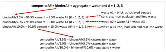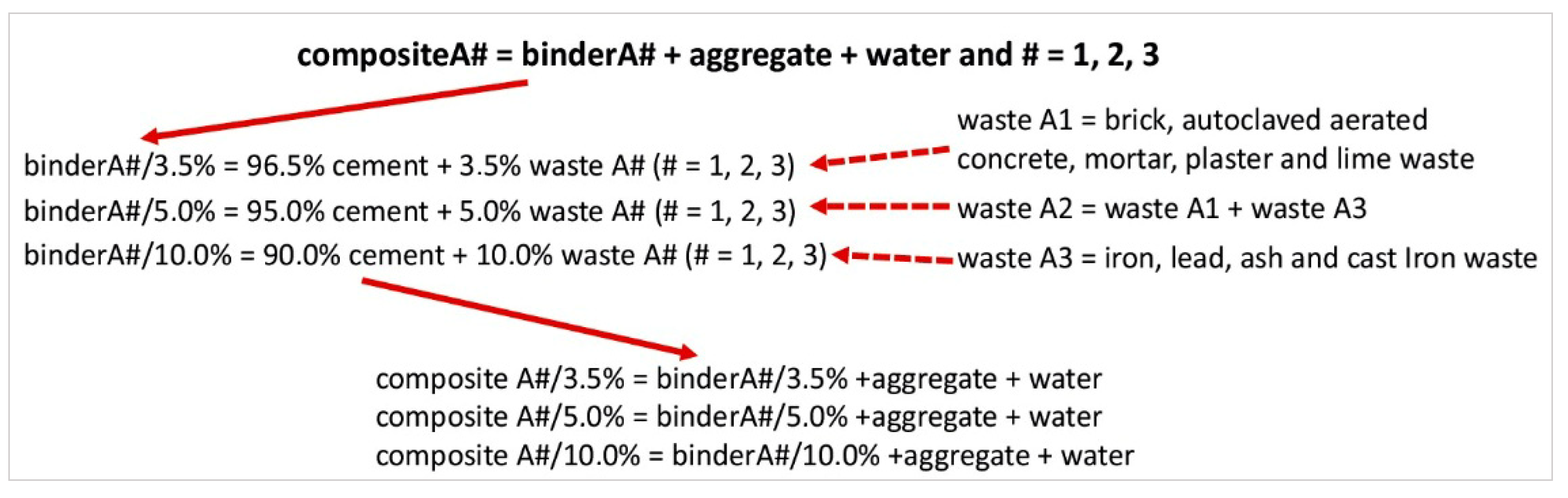 In this work, we use the term composite-cement stones to describe sustainable building materials that were a mixture of cement, aggregate, water, and powdered waste, which partially replaced Portland cement. Ten samples were obtained from a cement mortar containing various waste-material mixtures. The fabrication process of the composite-cement stones (called later as composites) is presented in Figure 3.