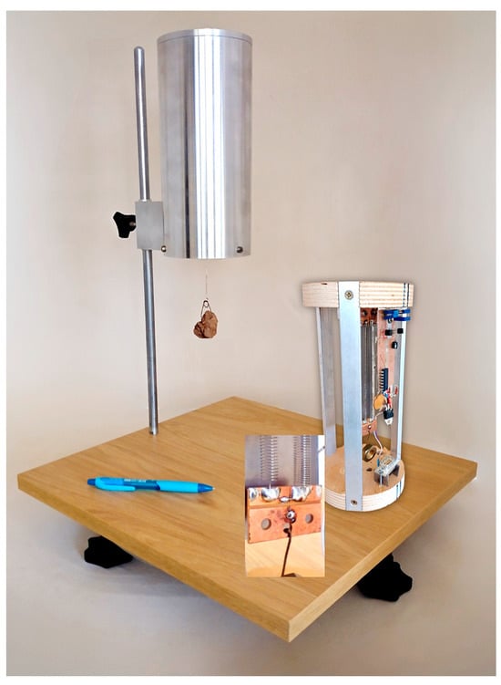 Measurement of bulk density was carried out using the hydrostatic buoyancy method with a high-sensitivity spring balance, as described in detail in the study [30]. The device employed a weight-to-frequency LC-oscillator transducer. In this transducer, the springs served simultaneously as the mechanical sensing element and as the inductive component of the LC resonant circuit. Variations in inductance caused by changes in spring elongation under the load of the suspended object resulted in a change in oscillation frequency. Figure 4 shows the experimental setup with the sample suspended on the inductive spring balance. Determination of the bulk density was based on measuring the difference between the weight of the object in the air and its weight in the liquid.