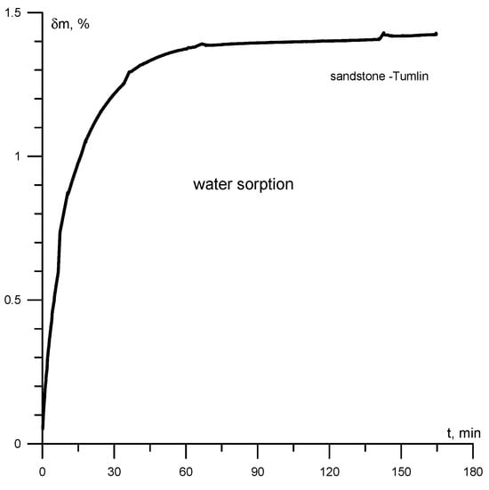 For the Tumlin sandstone, water saturation was complete after 180 min. An intensive increase in sample mass was observed during the first 40 min, resulting from the saturation of the accessible pore space. As shown in previous studies, the Tumlin sandstone exhibits a medium-grained texture and a porosity of approximately 11.9% [35]. The sample is dominated by intergranular open porosity, which allows water uptake sufficient to achieve full saturation within roughly 60 min. The Tumlin sandstone absorbed water amounting to 1.4% of its mass.