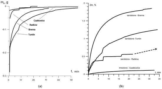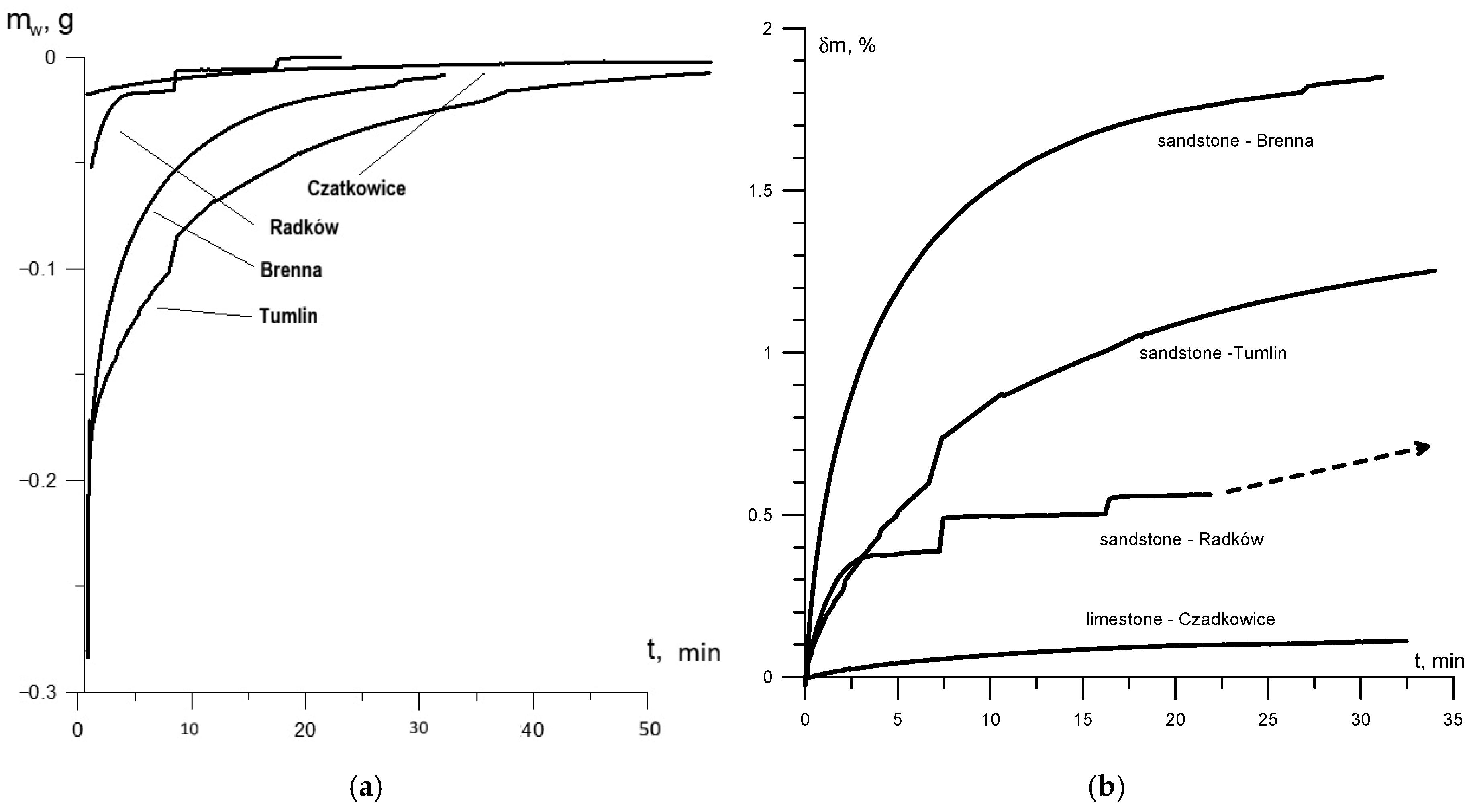 Figure 7 compares the initial water saturation curves of the tested rocks. To highlight the differences between samples, the plots in Figure 7a were shifted so that the y-axis origin corresponds to the asymptotic value representing the filling of open pores during the initial stage (up to 30 min). As seen in Figure 7a, the Radków sandstone absorbed 0.051 g of the water, corresponding to a mass increase of 0.55% (see Figure 7b). For the remaining samples, the following mass increases were obtained: limestone 0.020 g (0.16%), Tumlin sandstone 0.28 g (2.3%), and Brenna sandstone 0.18 g (1.87%). For the sandstones, the initial saturation period covering the first two minutes was highly dynamic (see Figure 7a). In contrast, the Czatkowice limestone exhibited no such rapid change, which is consistent with its structure. This limestone is a nearly monomineralic rock composed of calcite with numerous fine intergranular pores [35]. Its porosity is low, equal to 0.7% [36].
