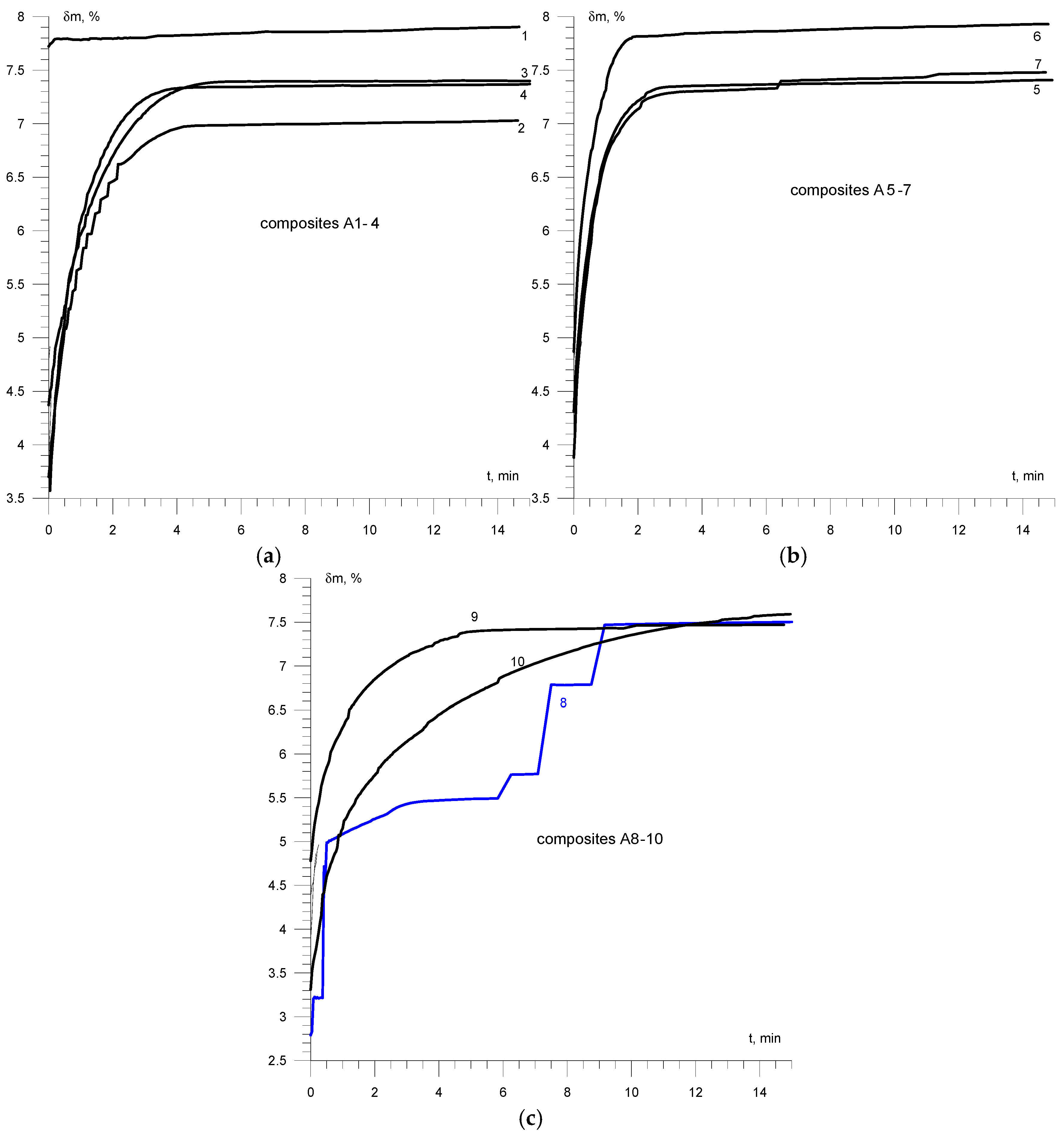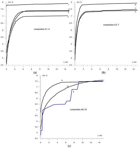 Figure 9. Saturation of composite-cement stones produced from (a) waste A1—composites A2–A4 and pure cement (sample A1); (b) waste A2—composites A5–A7; (c) waste A3—composites A8–A10.