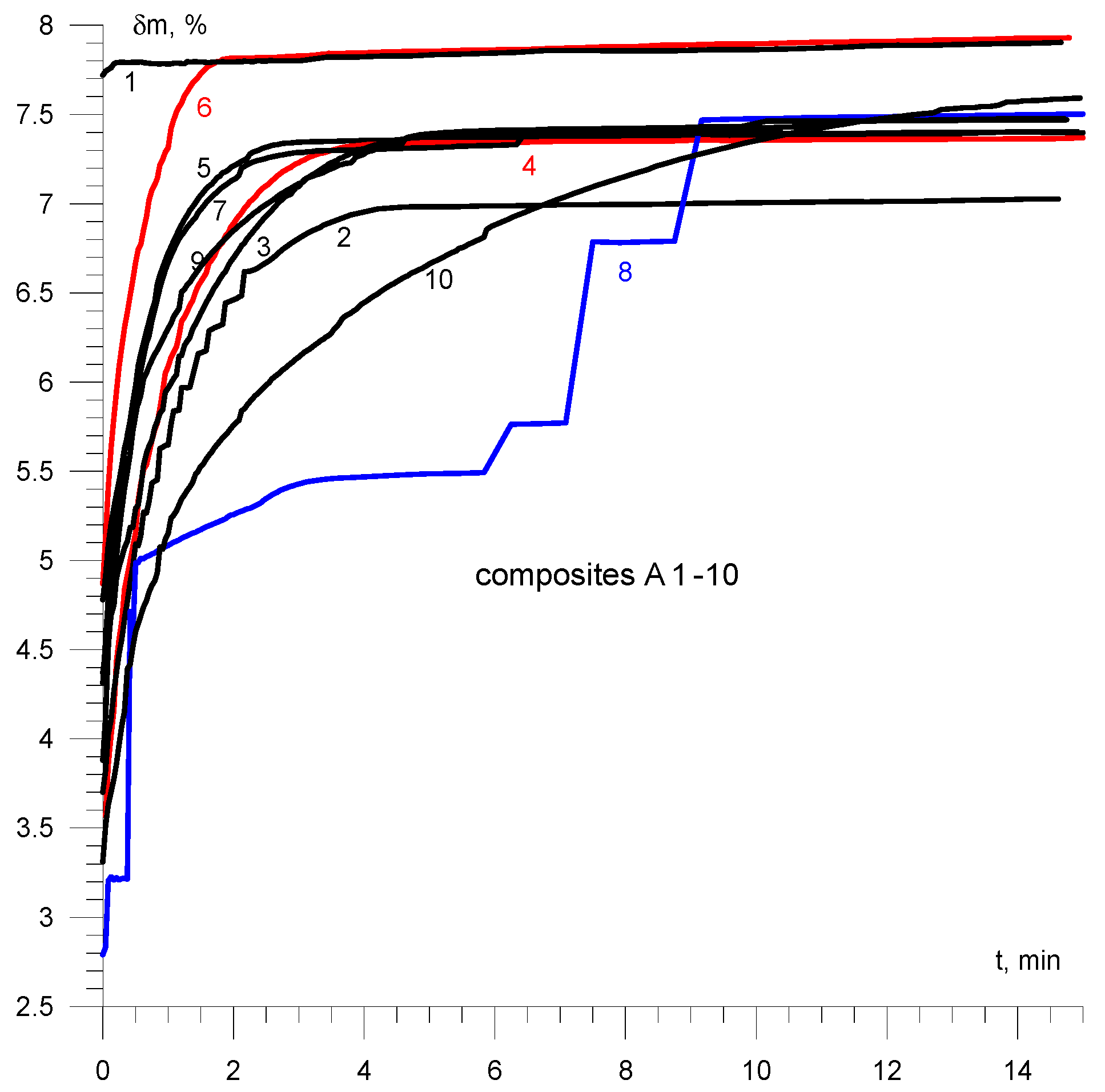 As shown in Figure 9c, the saturation kinetics of composites containing waste A3 exhibited the greatest variability. Samples A8 and A9 reached a constant absorption level after 10 min and showed similar total porosity values of 22.77% for A8 and 22.54% for A9.