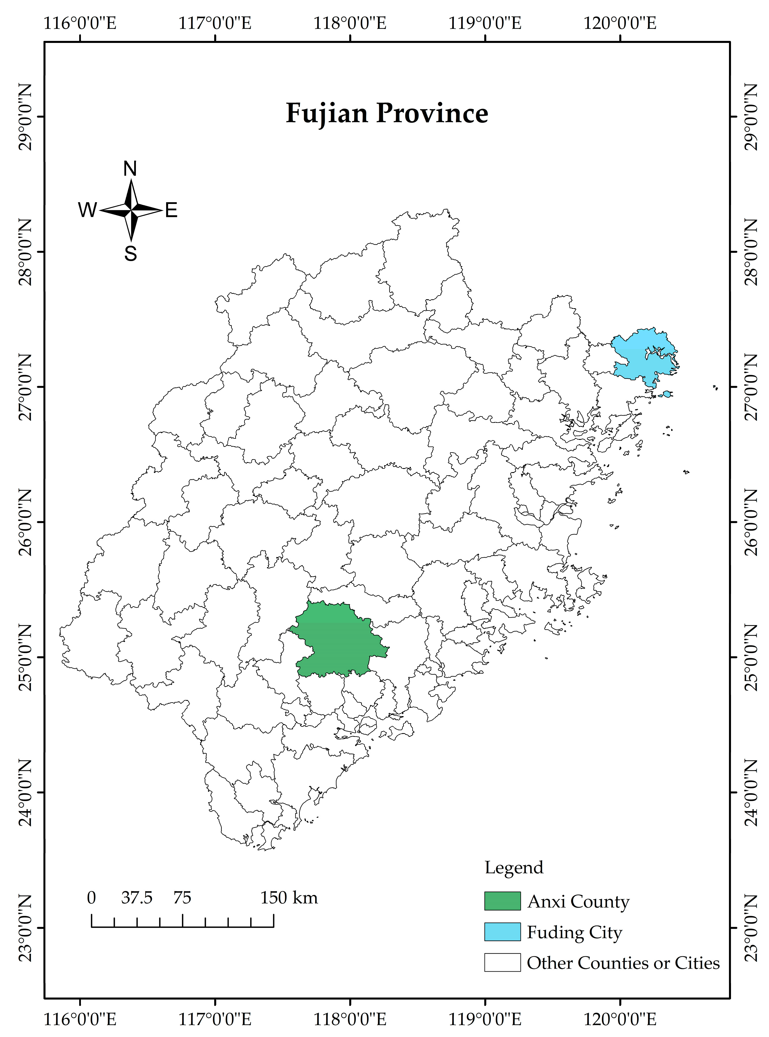 27]. However, most previous studies have focused on single dimensions or specific indicators—such as livelihood capitals, income, or well-being—rather than providing a holistic assessment of farmers’ sustainable livelihoods levels within AHS sites. Moreover, existing research has primarily investigated the influence mechanisms of AHS conservation on rural residents’ income from a macro perspective, with limited evidence from micro-level analyses. Therefore, this study focuses on farmers from two Tea-GIAHS sites—the Anxi Tieguanyin Tea Culture System (ATTCS) and the Fuding White Tea Culture System (FWTCS) in Fujian Province, China. Employing mediating effect models, it examines the mechanism through which AHS conservation influences farmers’ sustainable livelihoods, aiming to provide theoretical and practical support for formulating effective AHS conservation and development policies. Compared to existing research, the marginal contributions of this paper are twofold. First, it offers a multidimensional and systematic assessment of farmers’ sustainable livelihoods in AHS sites. Second, it investigates the specific pathway through which AHS conservation enhances farmers’ sustainable livelihoods.
