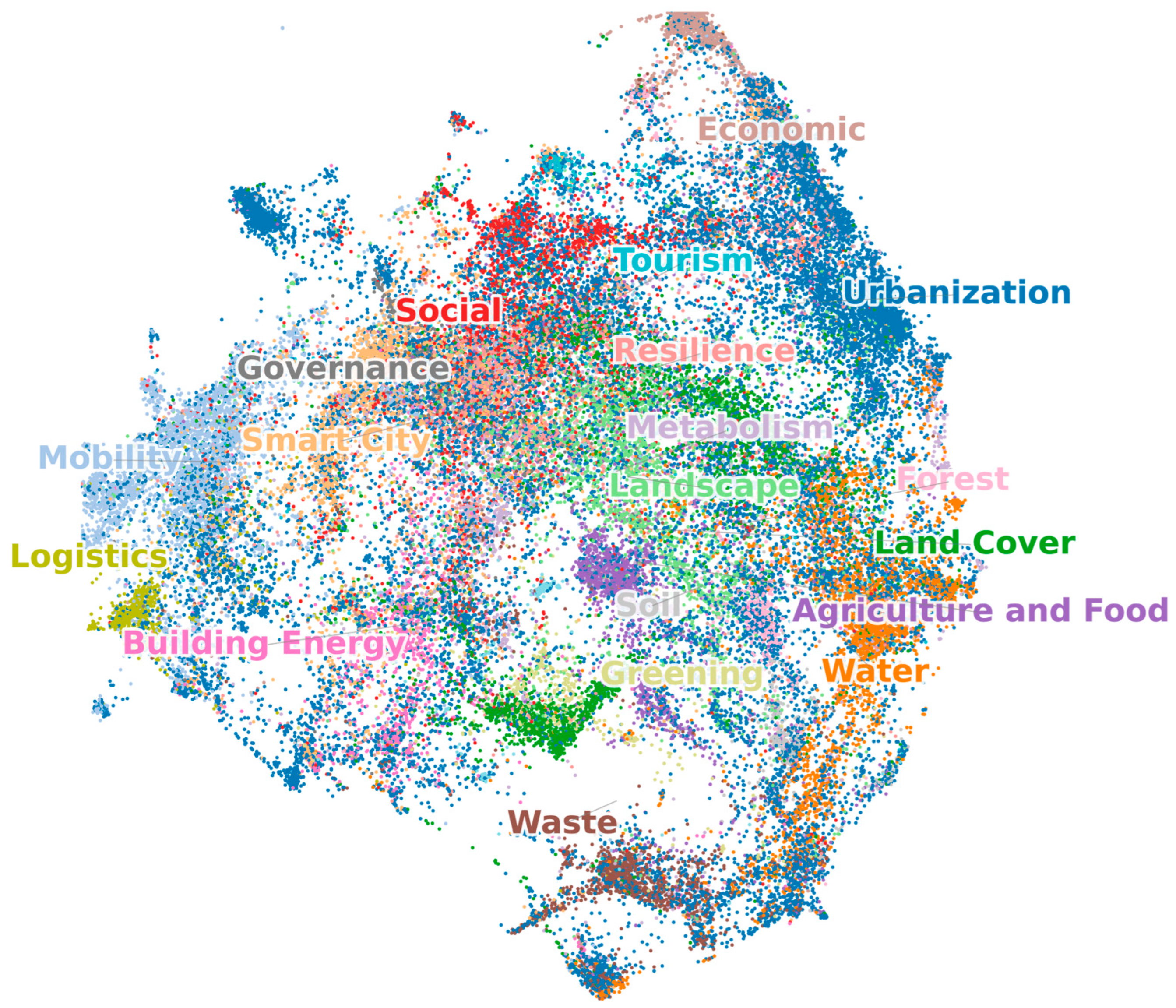 The average published years of papers in the clusters were between 2015 and 2021. The recency of the average published year indicates the level of recent scientific attention. The Economic (12), Urbanization (1), Waste (11), Logistics (17), and Greening (18) clusters contained relatively recent publications. The next newest groups were Land Cover (5), Building (13), Mobility (2), Landscape (6), and Smart City (4). The Agriculture and Food (9), Tourism (19), Governance (15), and Social (7) clusters had intermediate or slightly older average published years. The Forest (14) cluster had an average published year of 2015, meaning that relatively few papers have been published recently. The details of all clusters including more than 500 papers are provided in the