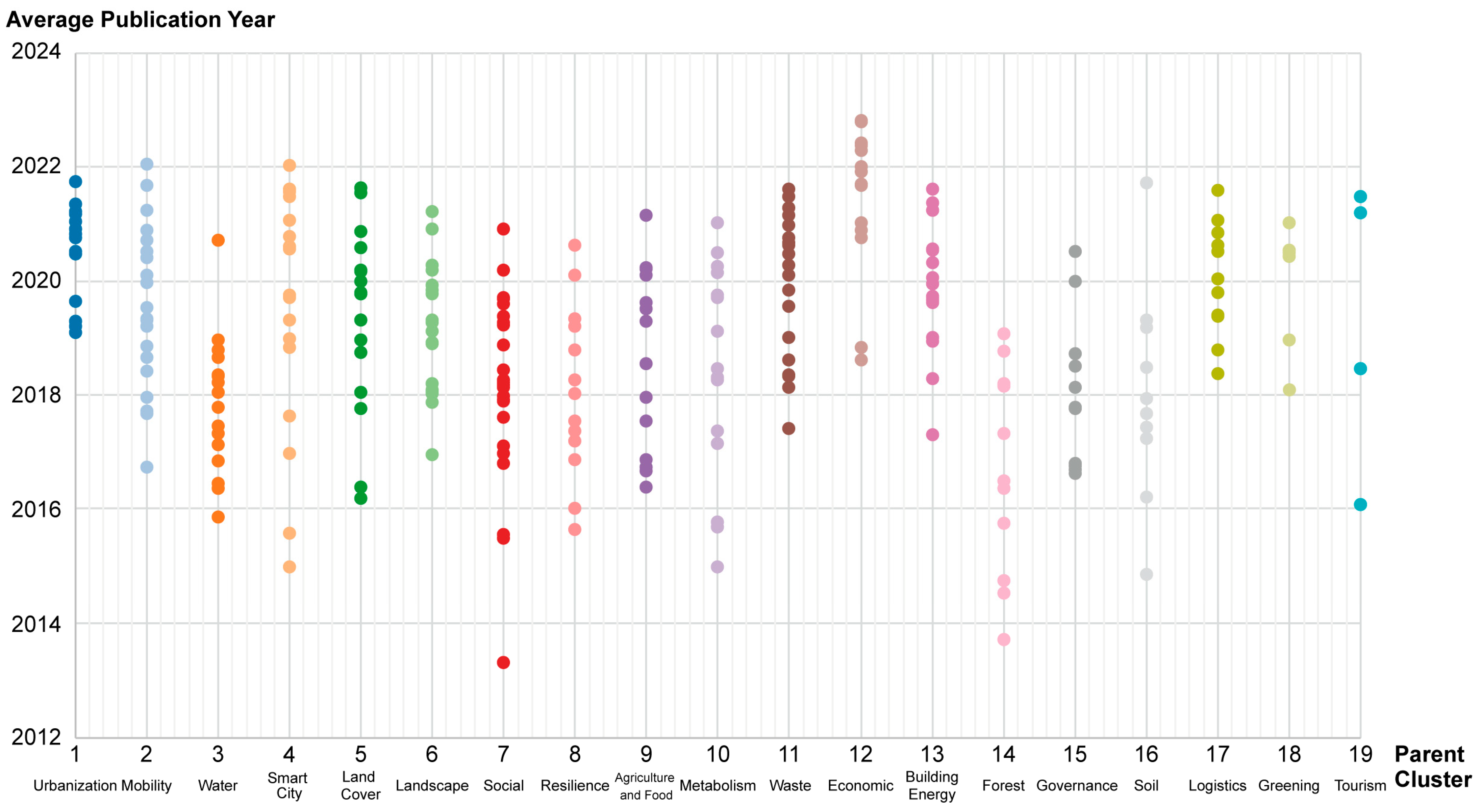 Figure 4 shows the average publication years of the sub-clusters. In this figure, the subcluster data are aligned vertically with their corresponding parent clusters. The results in the figure indicate that relatively older/newer sub-clusters exist within each cluster. Concretely, some sub-clusters within Economic (12) represent the newest topics among all sub-clusters. Others, such as Urbanization (1), Mobility (2), Smart City (4), Soil (16), and Land Cover (5), contain the next newest sub-clusters. The details of each sub-cluster are provided in the