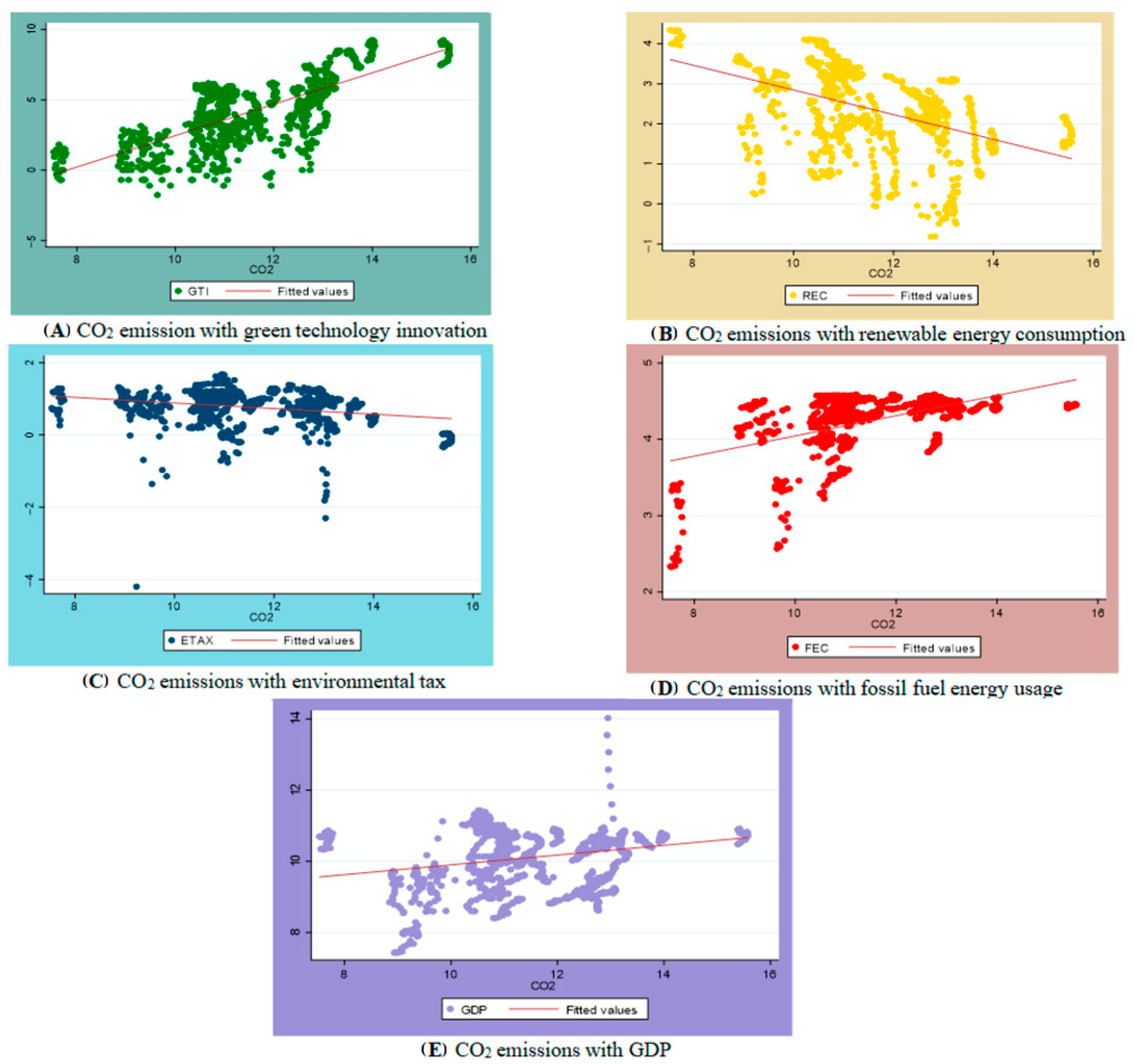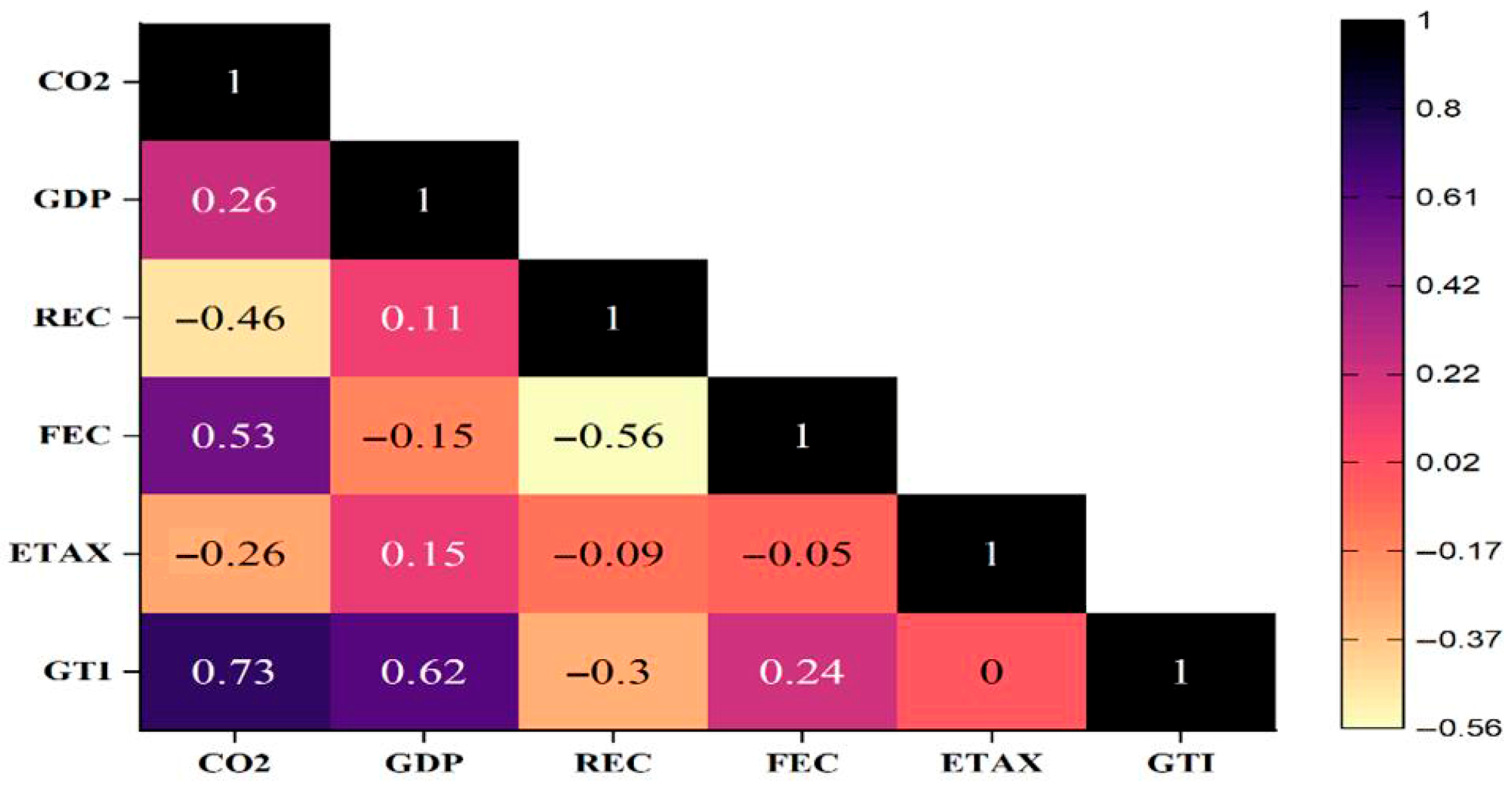 2 emissions exhibit a counterintuitive positive correlation with GTI, suggesting innovations may coexist with carbon-intensive processes or exhibit delayed mitigation effects. Conversely, REC shows a clear negative correlation, confirming cleaner energy’s decarbonization role. ETAX displays no discernible trend, indicating that effectiveness depends on enforcement rigor, rate calibration, and complementary policies. FEC demonstrates a strong positive relationship, reinforcing carbon-intensive energy’s environmental impact. GDP exhibits a weak positive correlation, with data dispersion reflecting heterogeneous growth-emissions linkages across economies due to varying efficiency and policies. These visual patterns align with