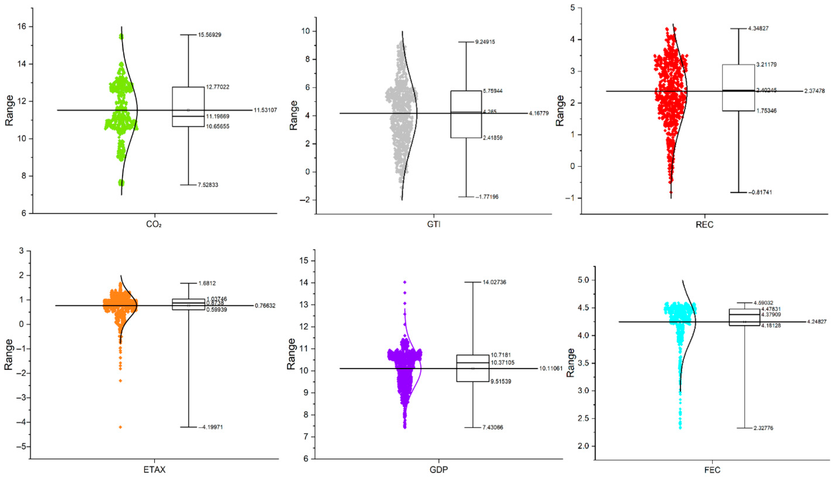 2 emissions, GTI, REC, ETAX, GDP, and FEC, offering a visual summary of their distributions and dispersion. For CO