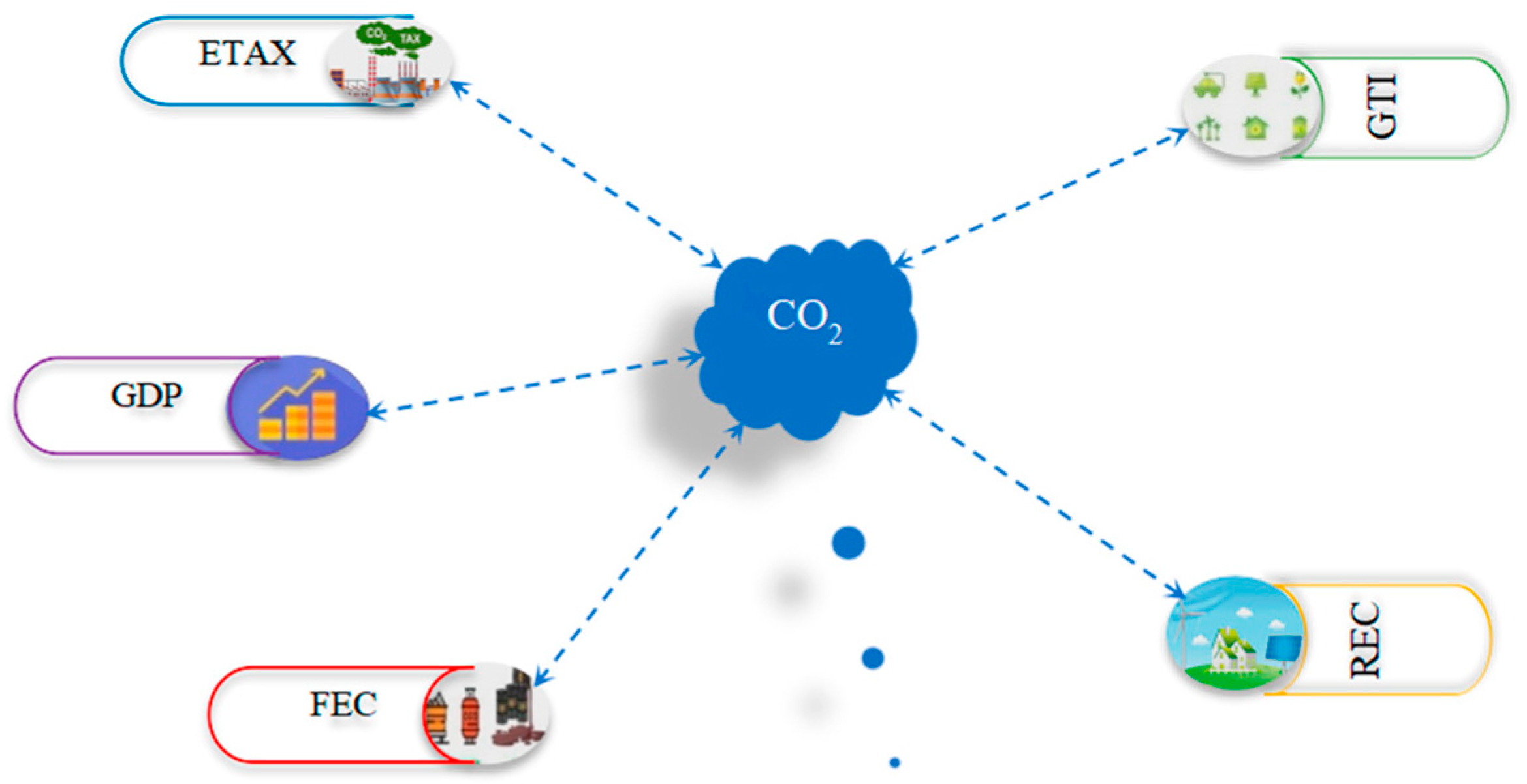 Environmental Taxes (ETAX): Utilizes “environmental taxes revenue” from the OECD statistical database. It is usually measured as a percentage of GDP or total taxes for cross-country comparisons. This indicator aims to capture the overall policy intensity of countries in using price-based tools for environmental regulation.