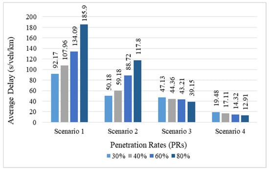 Comparison of Average Vehicle Delay among Scenarios at Different Penetration Rates (PRs).
