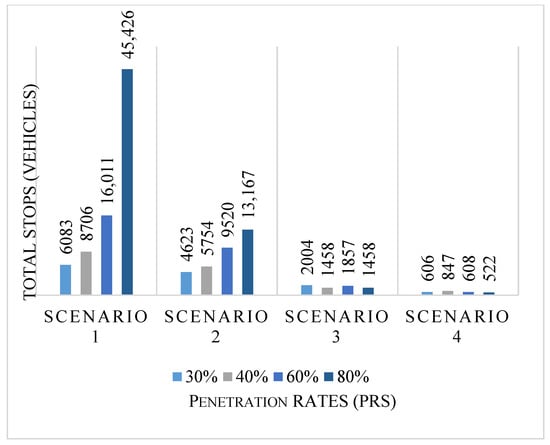 Comparison of Total Stops among Scenarios at Different Penetration Rates (PRs).
