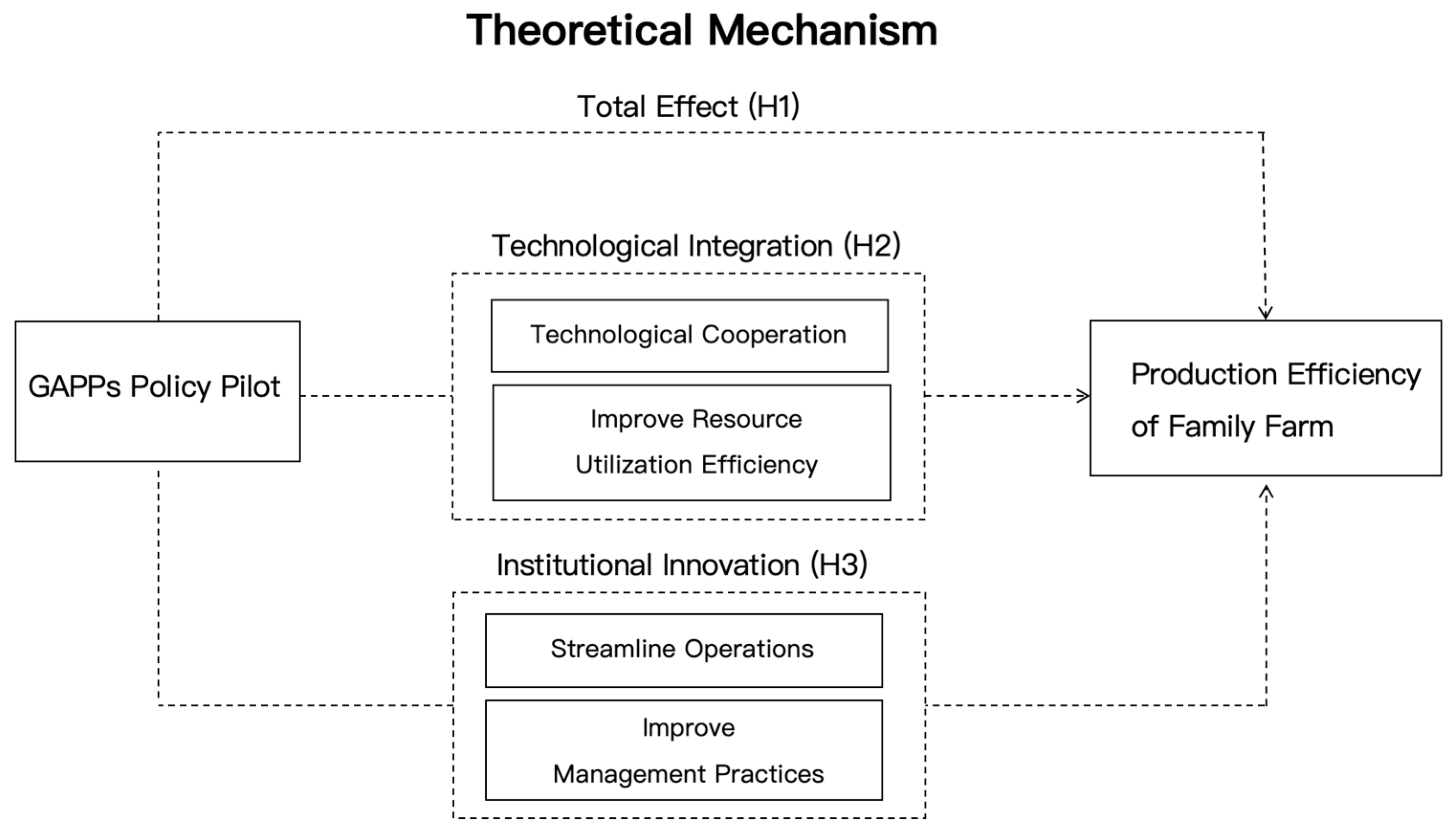 Agricultural modernization encompasses not only technology but also the necessity for policy reforms that drive progress. Changes in rural land systems increase the efficiency of resource utilization. Concurrently, farming practices are evolving. New methods of organizing farms facilitate better collaboration among groups, while improved management practices streamline operations. These various changes collectively contribute to the advancement of agriculture [22,23]. Institutional innovation plays a crucial role in enhancing productivity and can significantly increase agricultural production efficiency [24,25]. Strengthening the institutional framework for green agricultural development is a major task in the construction of GAPPs. By implementing pilot programs in specific regions, the government can overcome current limitations, thus greatly enhancing agricultural production efficiency (Figure 2). On this basis, the following research H3 is proposed: