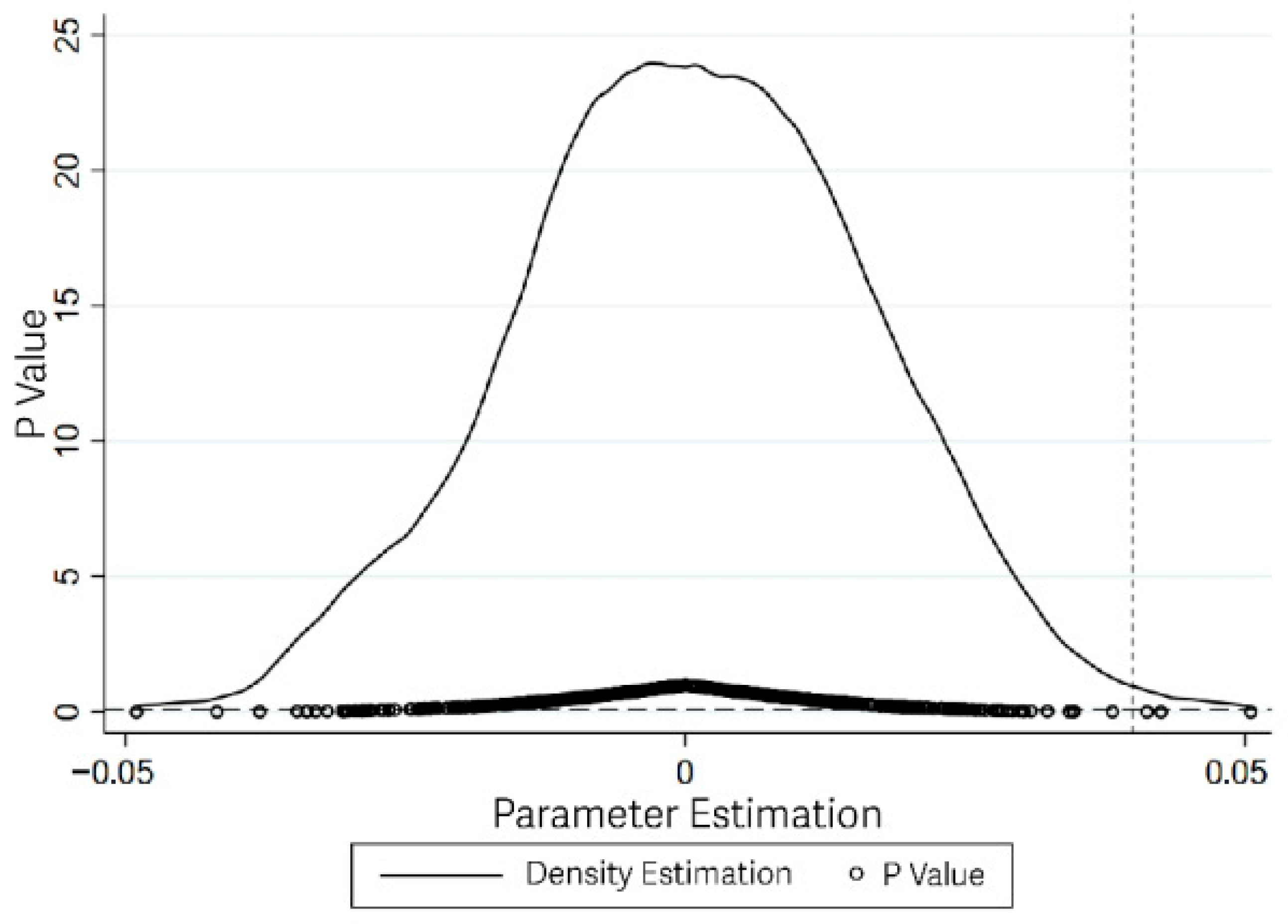 This study randomly selects a virtual experimental group and a control group for the placebo test. The experimental group is generated randomly, and a pseudopolicy dummy variable is set. Using Model 3500 regression simulations were performed. Figure 5 displays the distribution of coefficient estimates and p values for the impact of the policy on the production efficiency of family farms. The results show that the estimates of the pseudopolicy dummy variables are centrally distributed around 0 and that most of them are not significant at the 10% level, indicating that the empirical results of this paper are relatively robust and that other unobservable factors do not interfere with the impact of GAPPs on the efficiency of family farms.