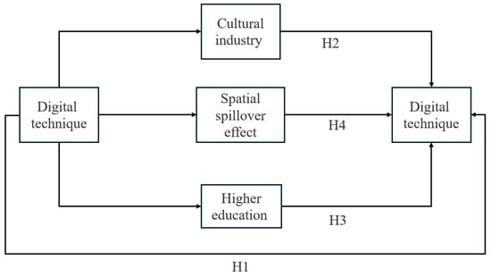 Digital technology provides critical support for revitalizing the cultural industry in three key areas: Firstly, it strengthens the industrial foundation by enabling the digital preservation and recreation of rural cultural heritage through digital archives and VR exhibitions [17]. By expanding its reach via internet platforms, it activates existing rural cultural resources, laying a solid groundwork for industrial development. Secondly, it drives industrial innovation: Digital platforms, such as live-streaming e-commerce and social marketing, expand marketing channels for rural cultural tourism and creative products, enabling targeted traffic acquisition and brand building. Simultaneously, big data analytics provides precise insights into consumer demand, fostering new customized and experiential cultural formats [18]. Finally, optimizing industrial services: Digital tools, such as innovative tourism platforms and online booking systems, comprehensively enhance visitor experiences before, during, and after trips, thereby improving service efficiency and satisfaction and boosting the attractiveness and competitiveness of rural cultural industries. Based on this, we propose the following hypothesis: