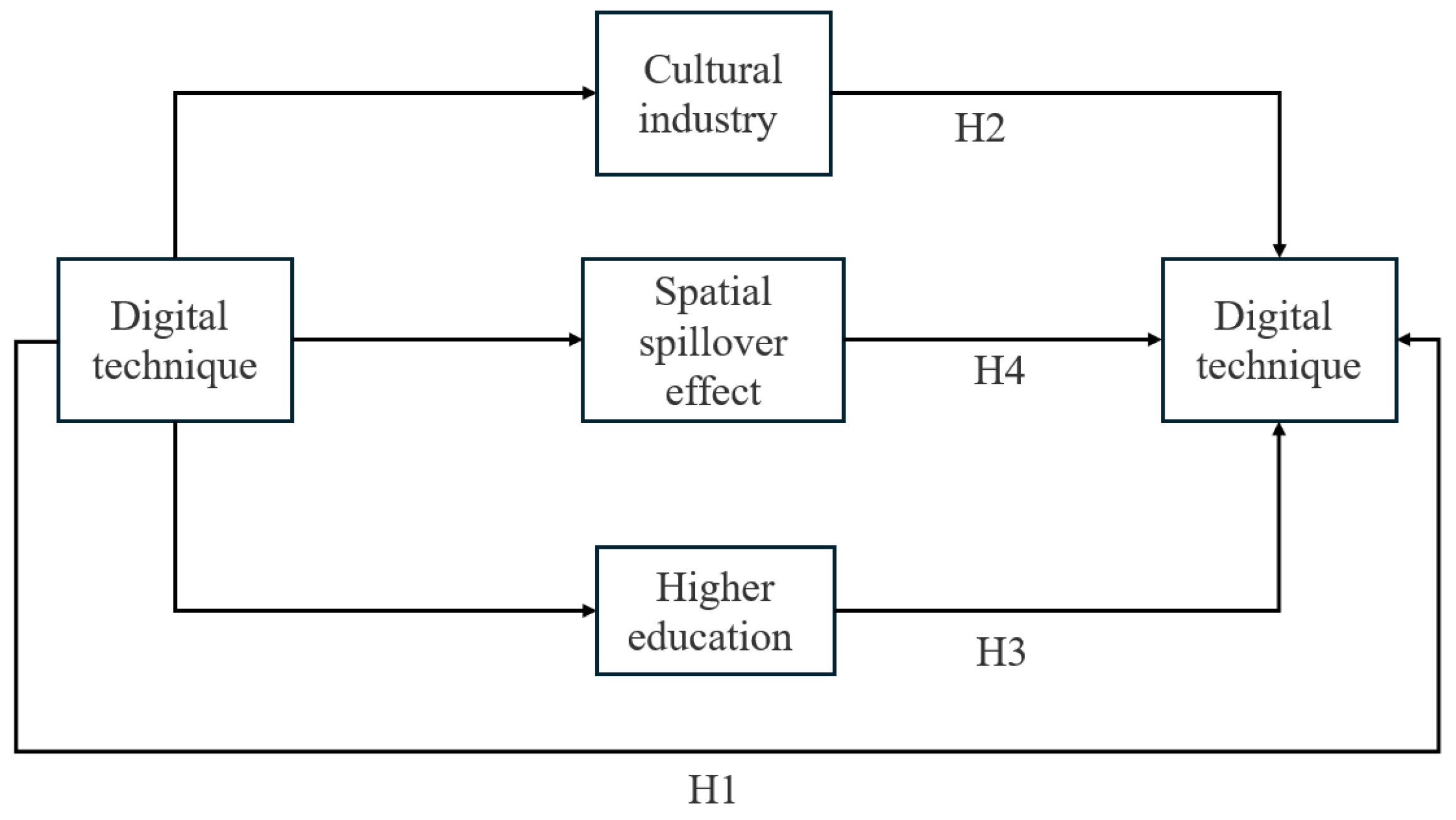 18]. Finally, optimizing industrial services: Digital tools, such as innovative tourism platforms and online booking systems, comprehensively enhance visitor experiences before, during, and after trips, thereby improving service efficiency and satisfaction and boosting the attractiveness and competitiveness of rural cultural industries. Based on this, we propose the following hypothesis: