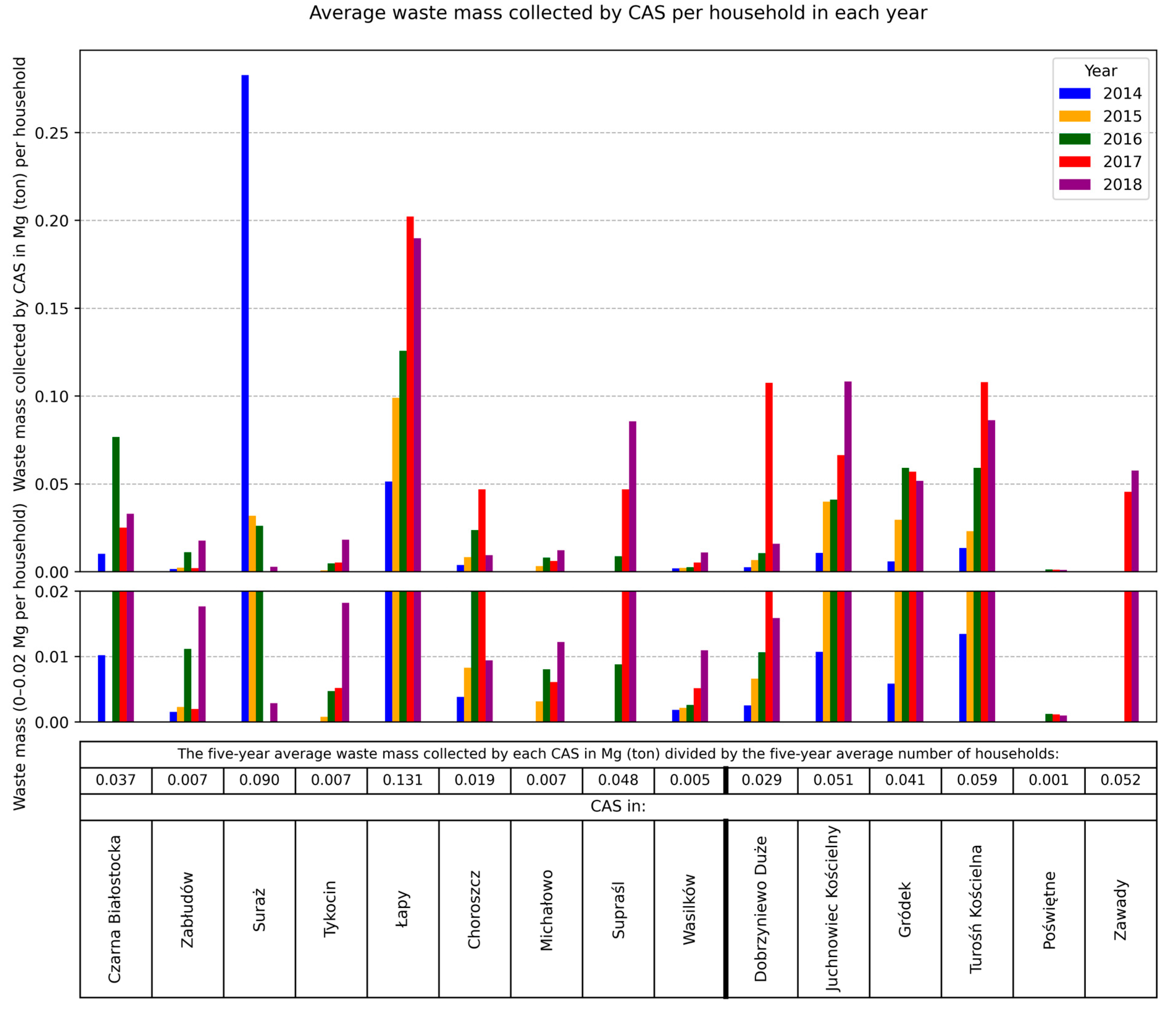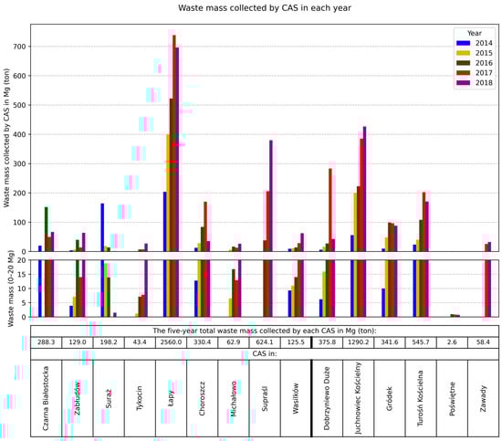 Figure 2 presents two complementary datasets for each CAS facility across municipalities: the annual waste mass totals (2014–2018), revealing yearly distribution patterns, and the 5-year waste mass totals (summary values per CAS facility). Both were calculated using 35 distinct, verified waste codes (