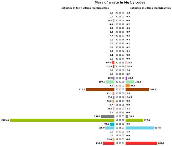Figure 4)—differed significantly between the town–village and village municipalities. This study documented 35 distinct waste codes across both types, with a markedly uneven distribution. The town-and-village municipalities dominated in the specific waste type 17 01 01 (2365.4 Mg vs. 377.1 Mg) and were the primary collectors for 16 01 03 (287.9 Mg vs. 58.6 Mg). Conversely, the village municipalities dominated in 17 09 04 (683.3 Mg vs. 250.0 Mg) and 17 01 07 (607.8 Mg vs. 195.0 Mg). The quantities were comparable for 20 03 07 (town-and-village: 615.2 Mg; village: 509.6 Mg) and 20 02 01 (town-and-village: 190.1 Mg; village: 190.5 Mg).