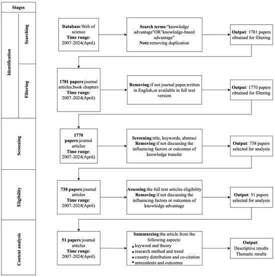 To systematically review the research related to knowledge advantages, a systematic review of studies concerning the knowledge advantage was conducted. This study incorporated key elements of the PRISMA guidelines and carried out four stages: identification, screening, eligibility, and content analysis (see Figure 1 and Supplementary Materials). This study integrated a bibliometric and content analysis to investigate and consolidate the findings. A bibliometric analysis is a quantitative analysis of the bibliographic features of a body of literature [34], which was used to analyze research hotspots and development trends in a particular field. In this study, articles were visualized and analyzed by using Biobliometrix R and Citespace. Following the bibliometric analysis, this study conducted a content analysis, aiming to uncover patterns in the measurement, antecedents, and outcomes of knowledge advantages.