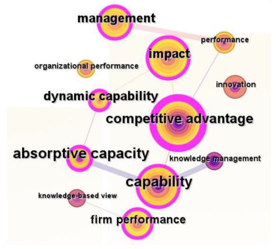 A co-occurrence analysis of keywords was conducted by using CiteSpace to demonstrate the connectivity between them. Keywords were initially selected by setting the minimum frequency of occurrence to six. Figure 2 shows the final visualization of the co-occurrence keywords. The size of a node provides a visual representation of the number of occurrences of a given keyword, with a larger node indicating more occurrences. With the exception of “competitive advantage”, the occurrence of the keyword “capability” is the highest; many scholars focus their research on organizational capabilities, particularly on how firms enhance their internal capacities to gain competitive advantages [35,36,37]. Additionally, much attention is afforded to “impact,” which reflects scholars’ attention to the factors influencing a competitive advantage and its effects. The relationships between knowledge advantages and “firm performance,” “management”, “absorptive capacity,” “innovation,” “knowledge management,” “knowledge-based view”, and “dynamic capability” also attract particular attention.
