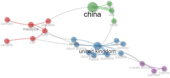 The number of articles published and the number of citations received by authors from different countries and institutions can reflect their influence and research progress. The international country collaboration network was developed, as shown in Figure 5. Each node in the figure represents a country/region. The closer the connection between two nodes, the greater the cooperation between the countries/regions [47]. The most frequent interactions were between China and the USA, with two collaborative articles, and the United Kingdom and Australia, with two collaborative articles.