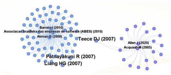 A literature co-citation analysis is a research methodology used to measure the extent of relationships between the literature and can help to model and monitor the intellectual structure of the scientific specialties [48]. Figure 6 shows the network of citations for knowledge advantage. The large nodes in the middle of the network represent the most cited articles. Teece (2007) synthesized the concepts and research findings in various fields to build a dynamic capability framework [49]. The two articles performed an empirical analysis by constructing a theoretical model [5,50]. The smaller center around the dense center represents the knowledge advantage articles in their center and the citations that have not been co-cited around them.