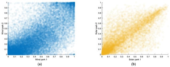 Correlation of two wind parks’ generation (a) and two solar parks’ generation (b).