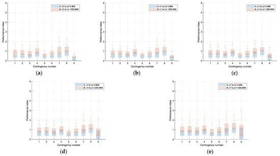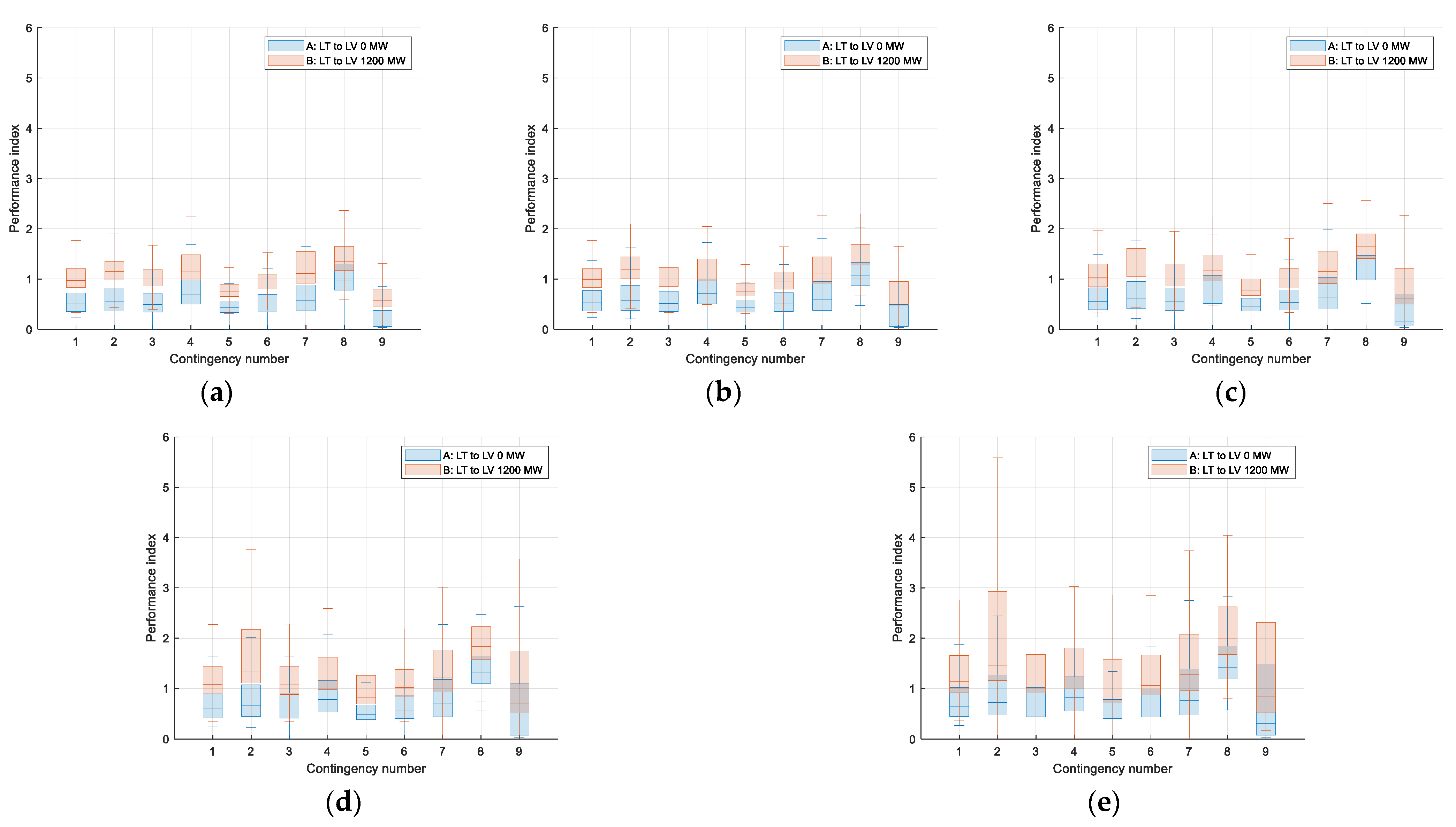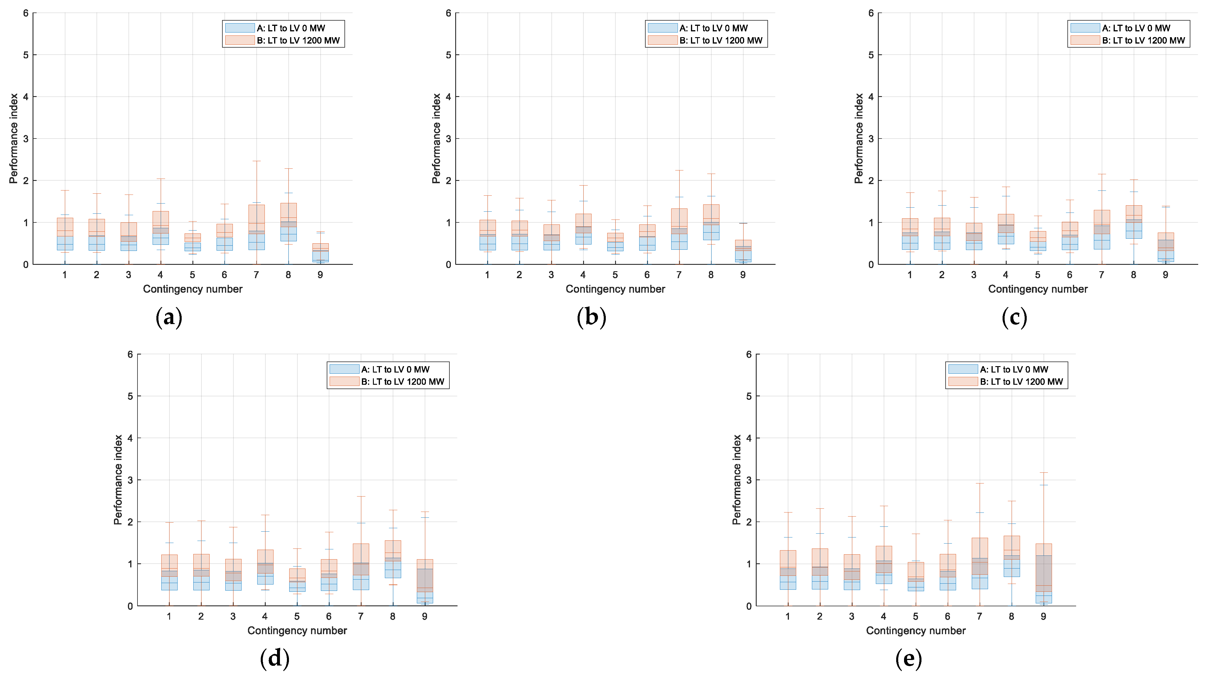 Performance index (year 2027) with different installed capacity of offshore wind farm: (a) 700 MW, (b) 1000 MW, (c) 1400 MW, (d) 2000 MW, (e) 2500 MW.