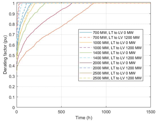 Since line loads depend not only on loads and solar and wind generation but also on inter-system flows, two boundary scenarios were distinguished. Priority is applied to electricity export from the Lithuanian power system to the Latvian power system. This scenario assesses the possibility that Lithuania will be the first in the development of RES and will export electricity to other Baltic countries. The maximum power flow in the Lithuanian–Latvian cross-border can reach up to 1200 MW.