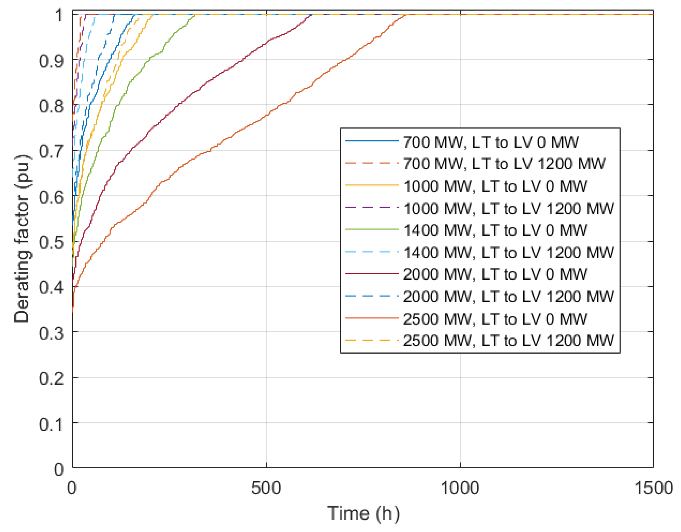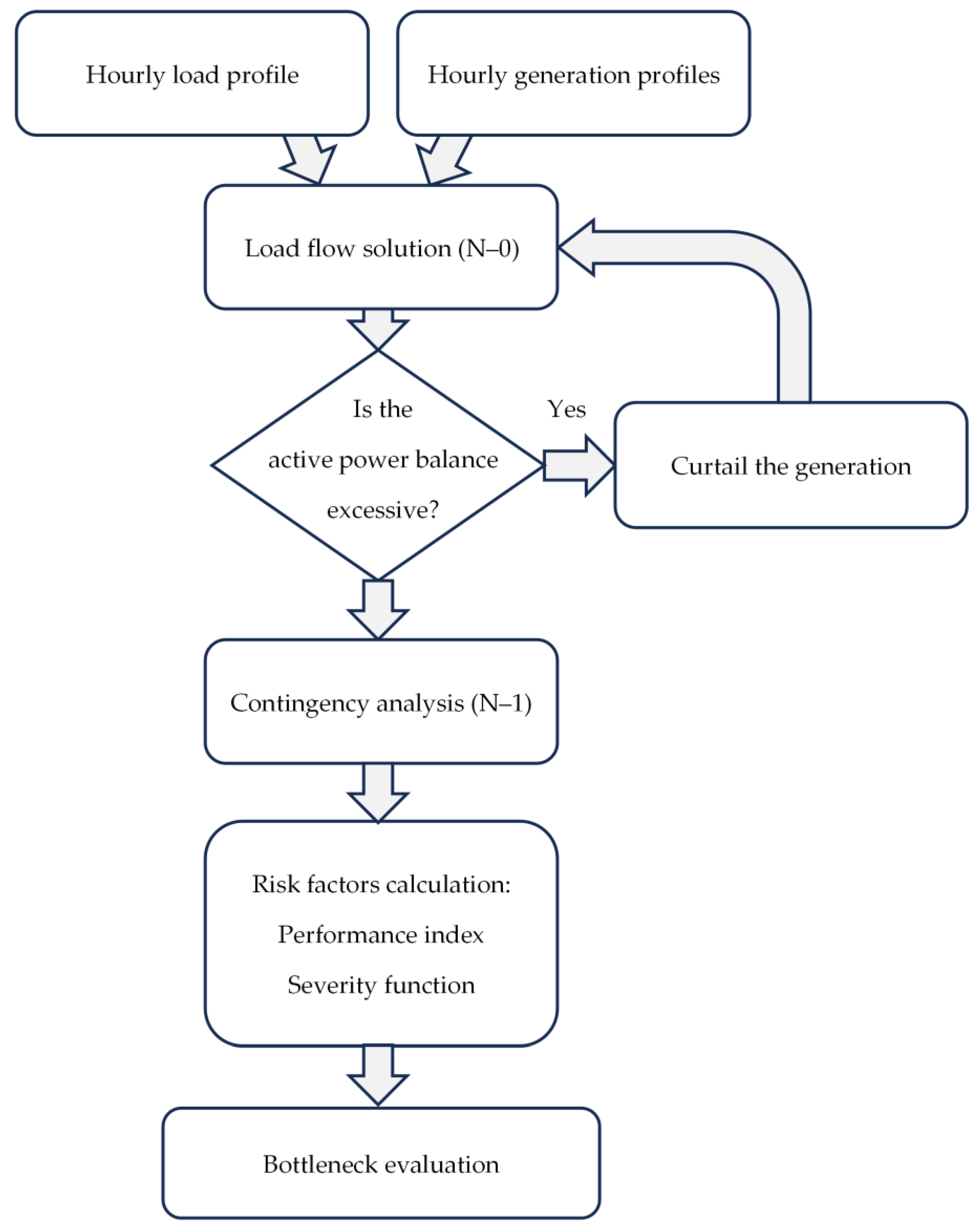 For each hour, the load flow problem is solved, checking the N–0 and N–1 contingencies, determining the load levels of the power lines, and identifying overloads.