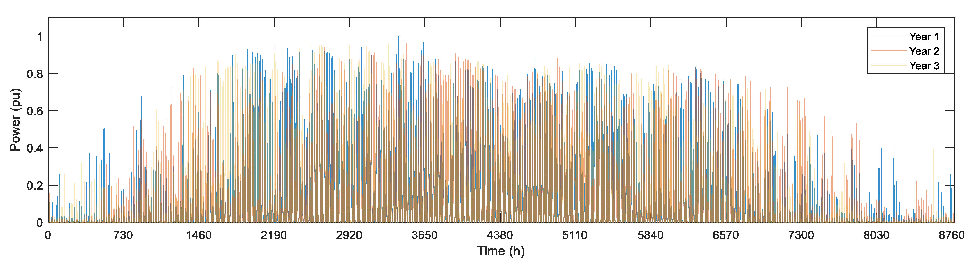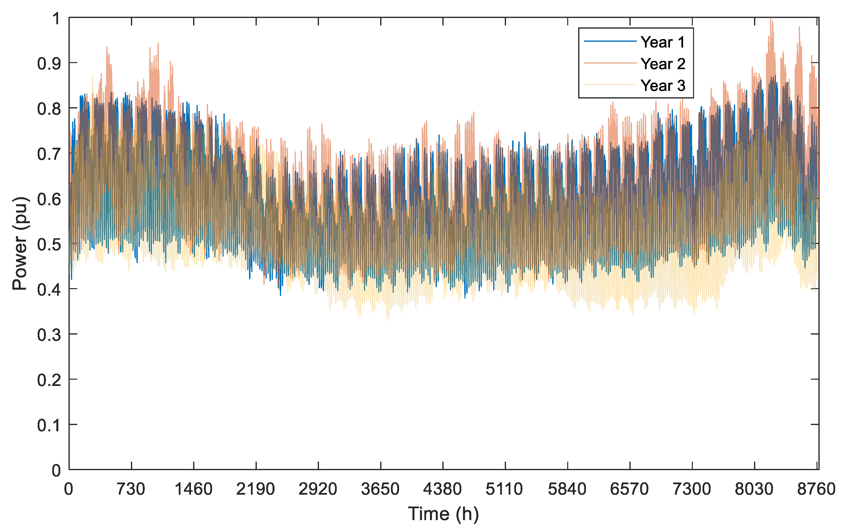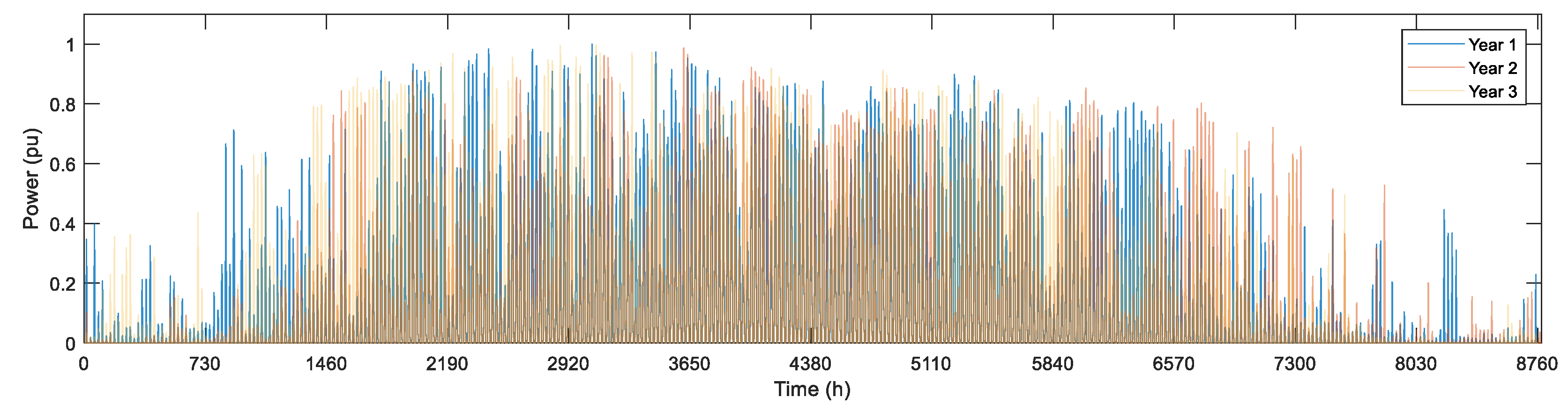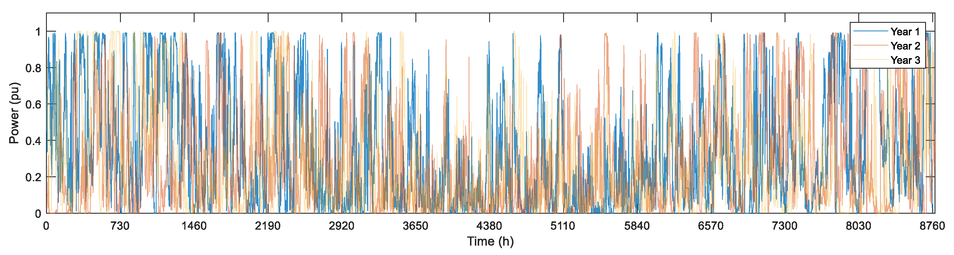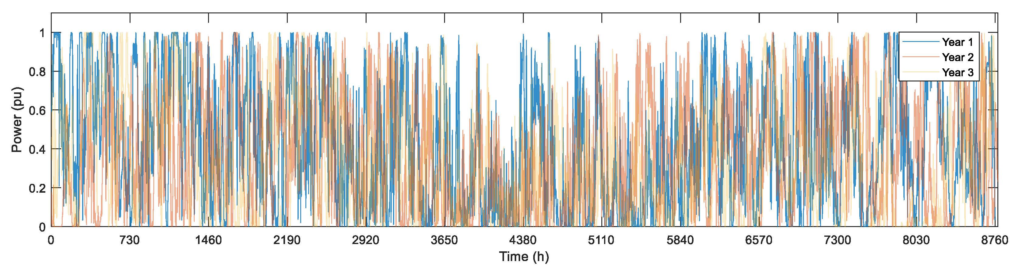 The load profile is presented in Figure 4, and generation profiles of two random wind parks and two random solar parks installed in different geographical locations of Lithuania are presented in Figure 5, Figure 6, Figure 7 and Figure 8. The load profile shows that the winter months of 2021 exhibit significantly higher demand compared to the corresponding periods in 2020 and 2022. This increase can be attributed to the lower temperatures observed in January, February, and December 2021.