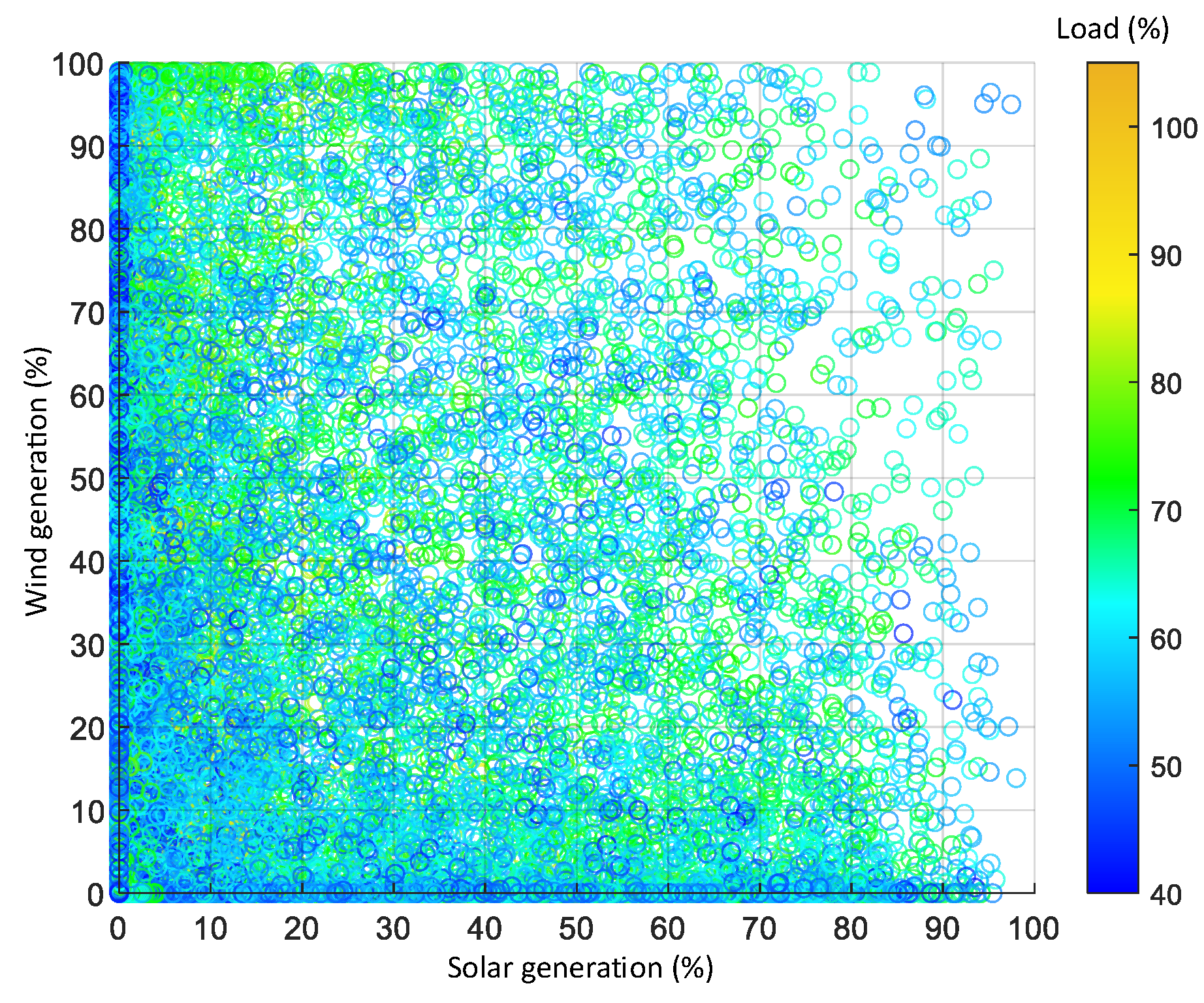 Distribution of solar and wind generation and load over a three-year period (one dot represents one hour). Warmer colour indicates higher system load.