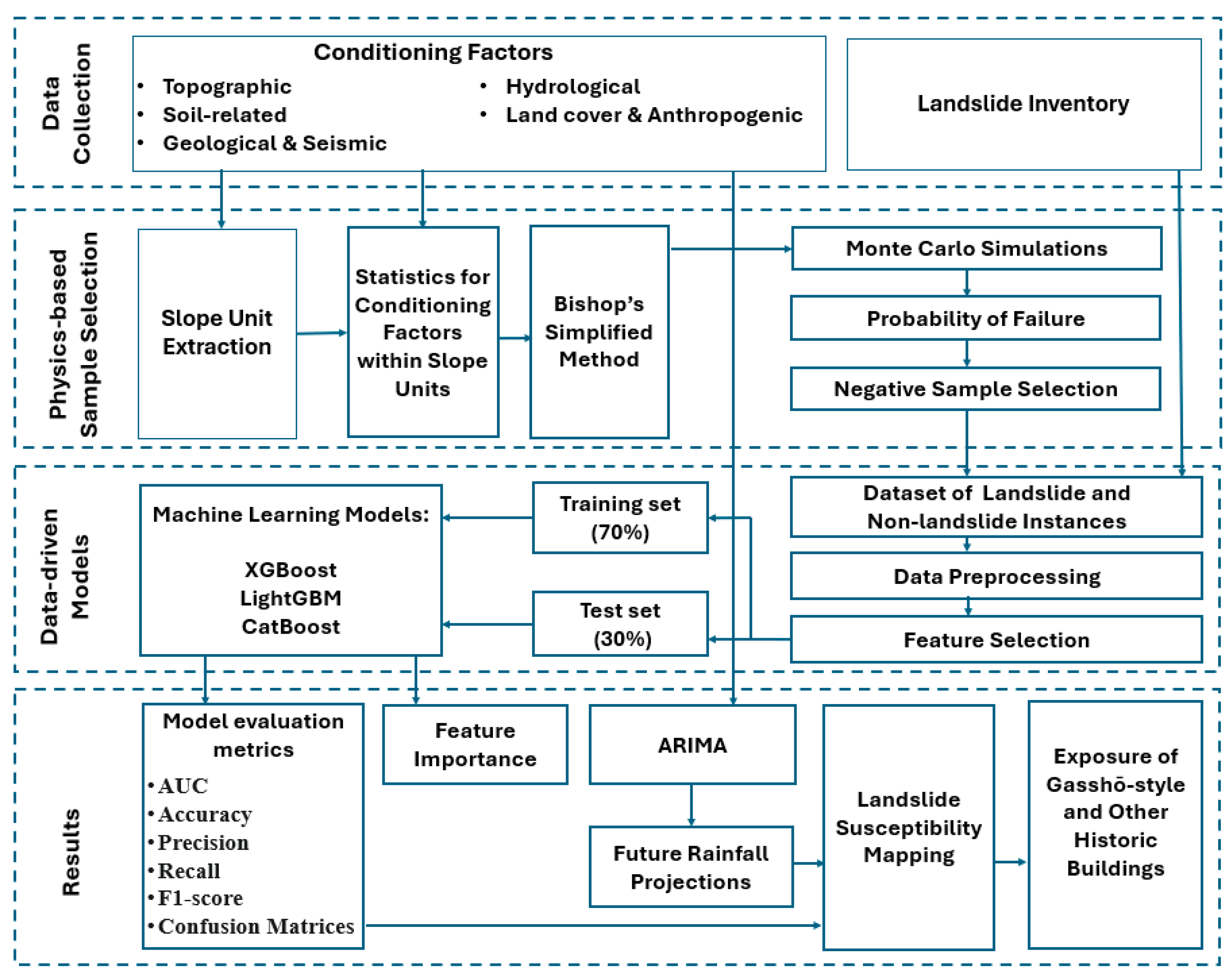 - Al-Najjar, H.A.; Pradhan, B.; He, X.; Sheng, D.; Alamri, A.; Gite, S.; Park, H.J. Integrating Physical and Machine Learning Models for Enhanced Landslide Prediction in Data-Scarce Environments. Earth Syst. Environ. 2024, 9, 3179–3206. [Google Scholar] [CrossRef]