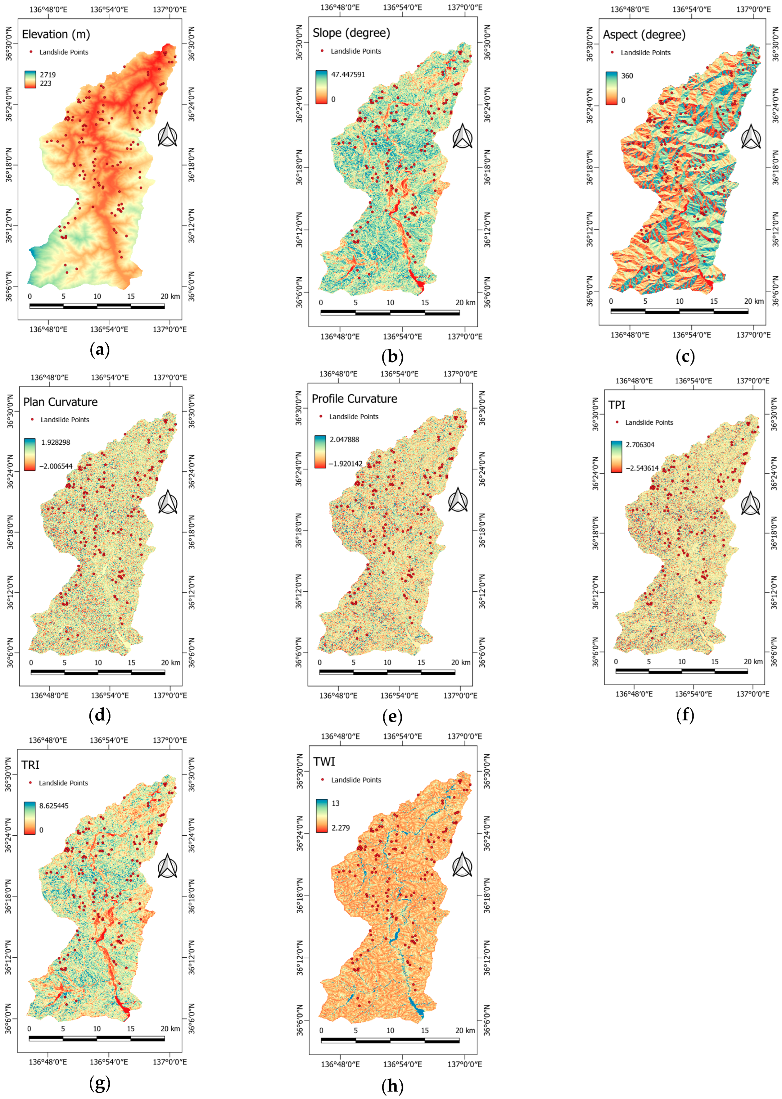 - Topographic Wetness Index (TWI) is a measure of the effect of topography on soil moisture accumulation, a key factor for landslide initiation (Figure 6h). It is calculated as follows: