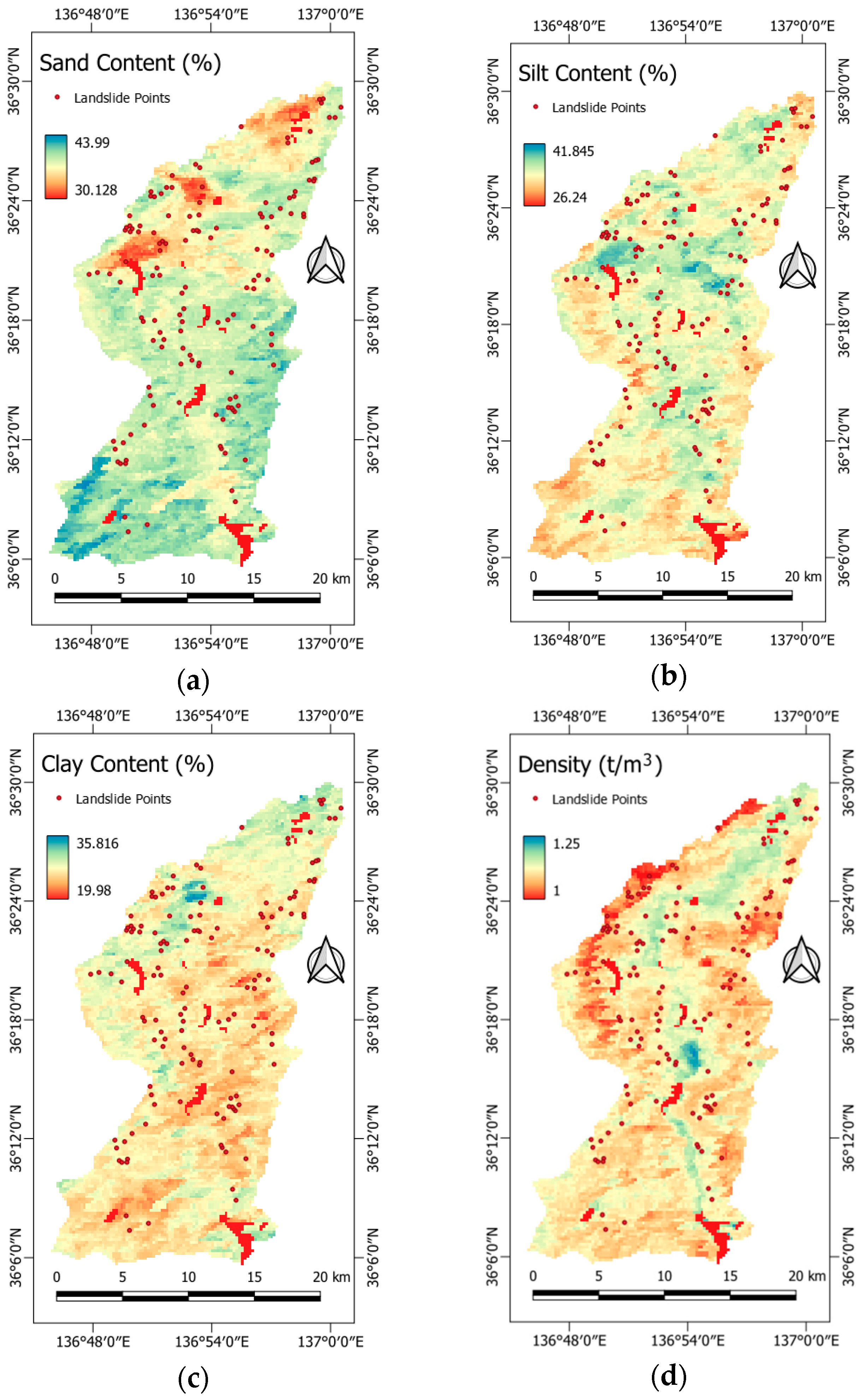 - Physics-Based Strategy: Slope angle, slope height, precipitation, lithology, and distance to roads were the most relevant feature predictors, which are closely related to the physical initiation of landslides. Interestingly, the SHAP plots also highlighted higher levels of importance for soil-related variables (proportions of clay, silt, and sand).