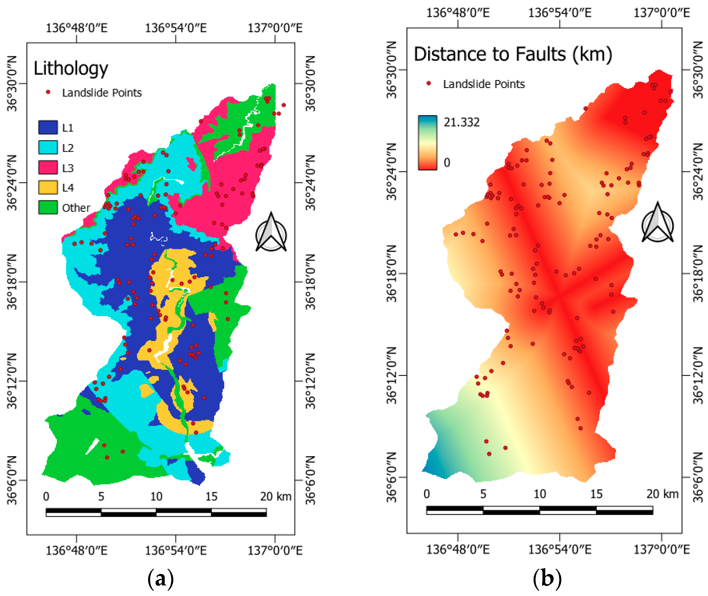 - Distance to Faults is another important geological factor that controls landslide susceptibility. Areas close to active faults generally have rock strength considerably weakened, which increases the possibility of landslide events. Therefore, distance to lines of fault become a very significant factor in LSM [54]. Fault data were obtained from the Geological Survey of Japan. Line faults in the area include the Atotsugawa, Kokufu, Ushikubi, and Shokawa fault zones, and area faults include the eastern part of the Tonami-heiya/Kurehayama fault zone and the Morimoto-Togashi fault zone [28]. A distance raster with a resolution of 12.5 m was generated to quantify proximity to these faults (Figure 8b).