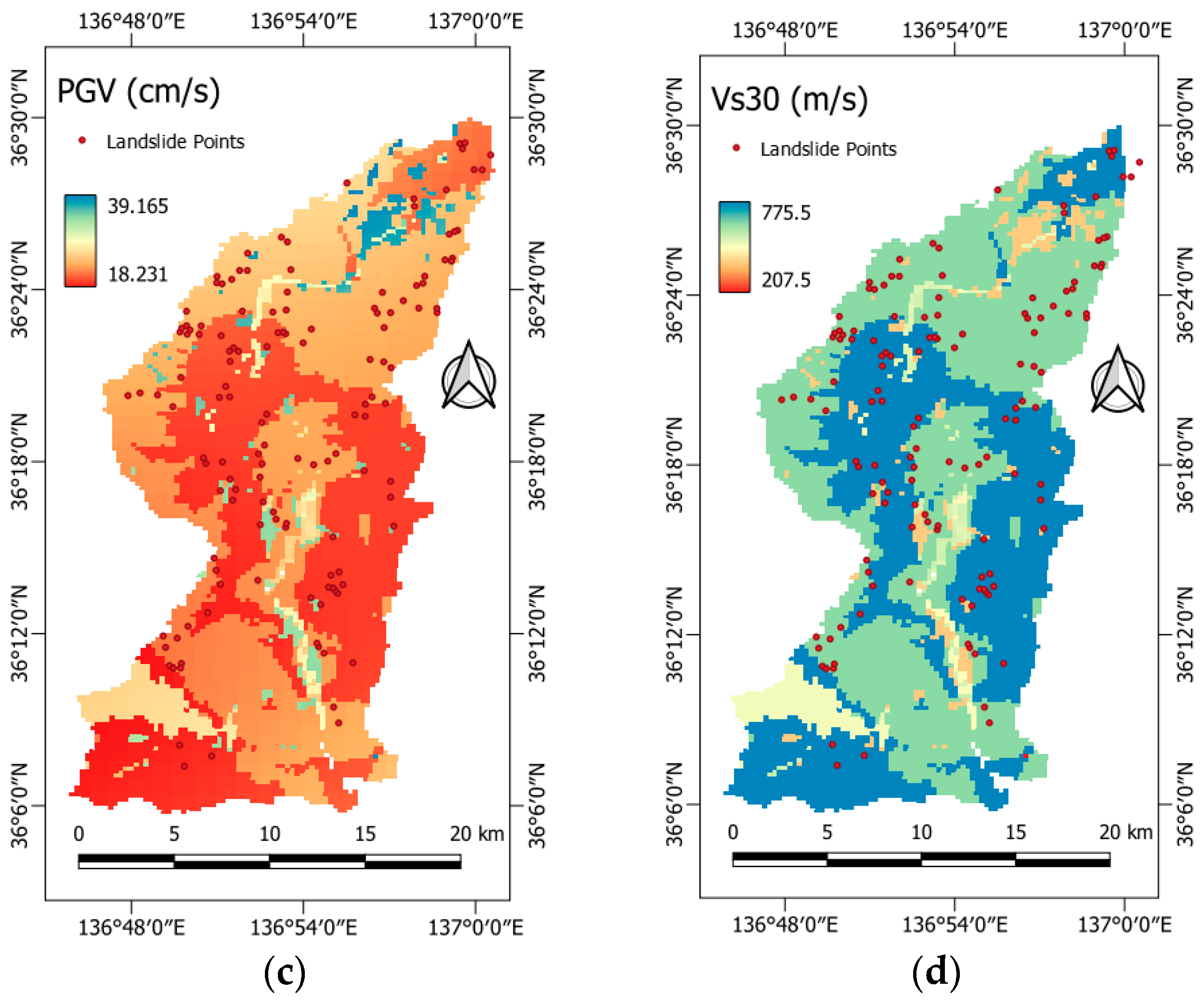 - Peak Ground Velocity (PGV) is an important seismic parameter quantifying the intensity of an earthquake and has been illustrated to be closely related to landslide initiation. In the study of Liu et al. [55], PGV was among the most important predictors in LSM. The PGV dataset was obtained from the Japan Seismic Hazard Information Station (Figure 8c).
