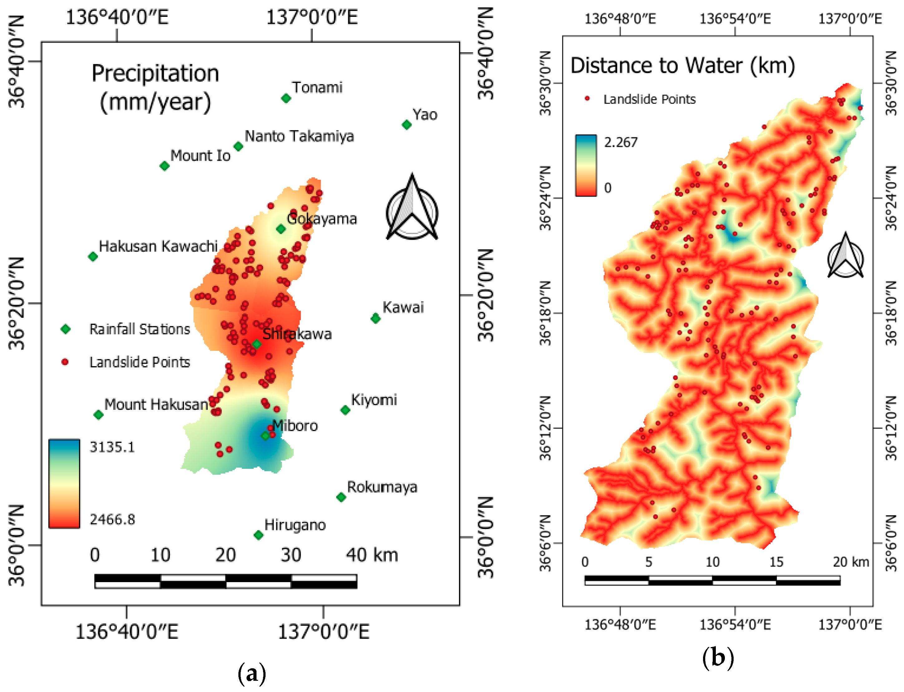 - Distance to Water is another important factor that affects landslide occurrence [19]. Proximity to water bodies tends to lead to increased surface erosion and soil moisture, reduction in soil cohesion, and thereby increased likelihood of slope instability. Water bodies, including rivers, streams, canals, and ditches, were mapped in vector format, and a corresponding 12.5 m resolution distance-to-water raster was derived (Figure 9b).
