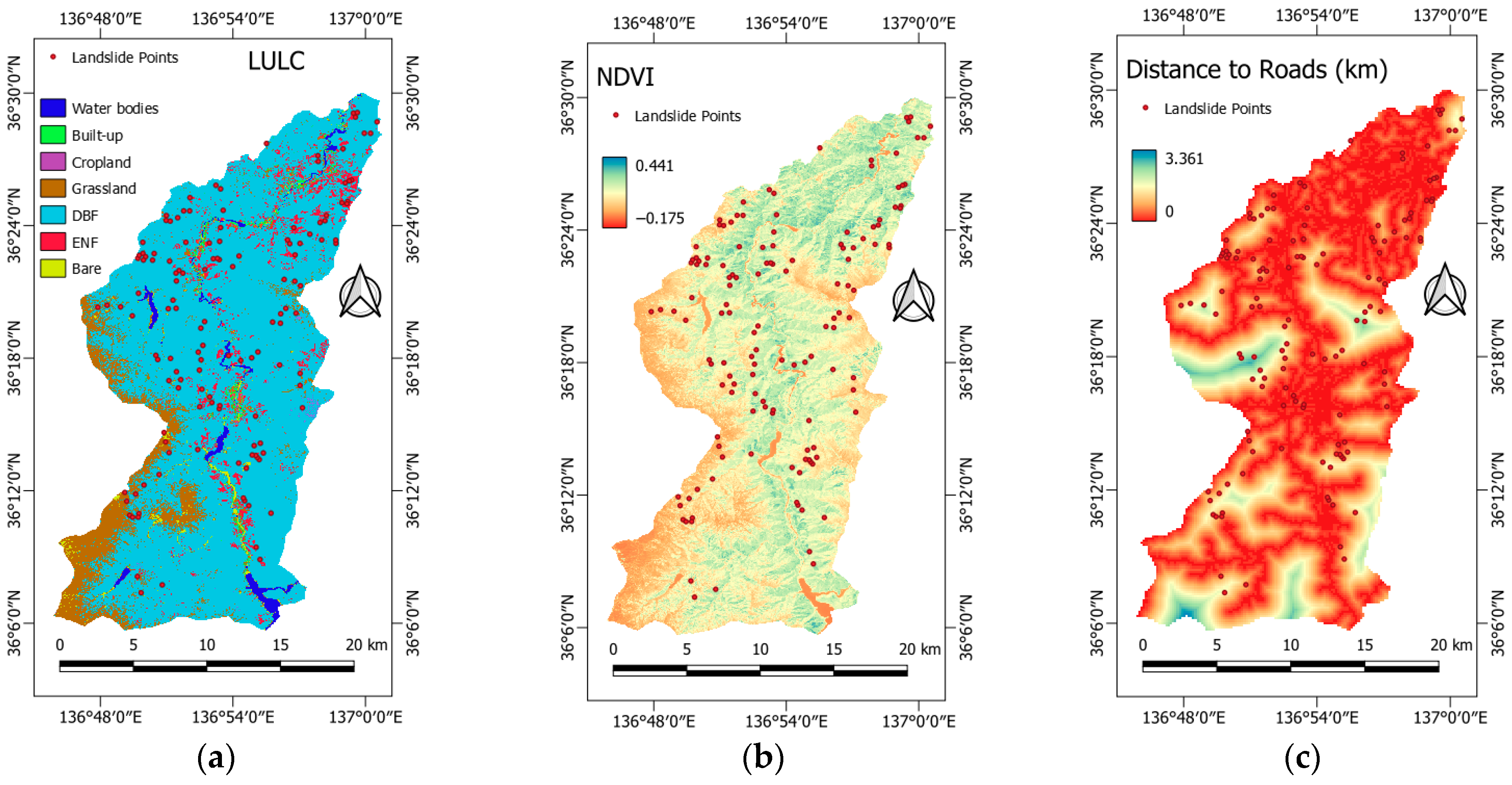 - Land Use/Land Cover (LULC) maps classify the Earth’s surface based on physical features such as forests, croplands, lakes, and wetlands. Land cover is considered as a tool to evaluate the influence of human activities on landslide initiation [63]. In this study, land cover classification was derived from ALOS-JAXA data, revealing that the majority of the investigated area is occupied by deciduous broadleaf forest (DBF) then by grassland and evergreen needleleaf forest (ENF) (Figure 10a).