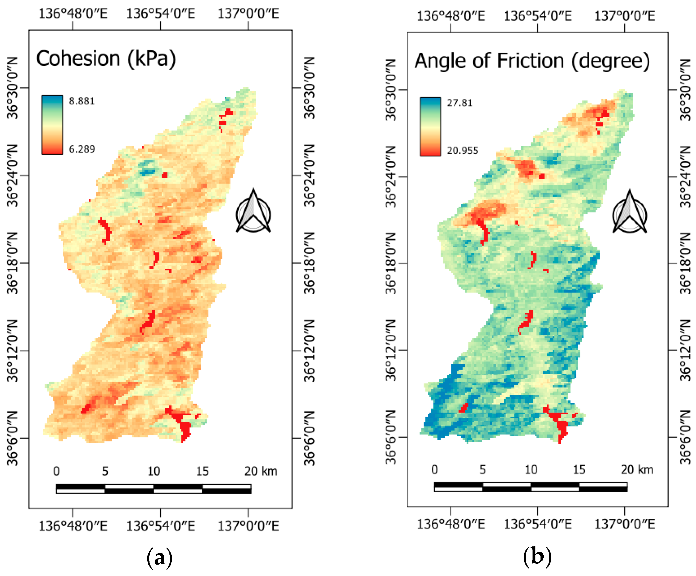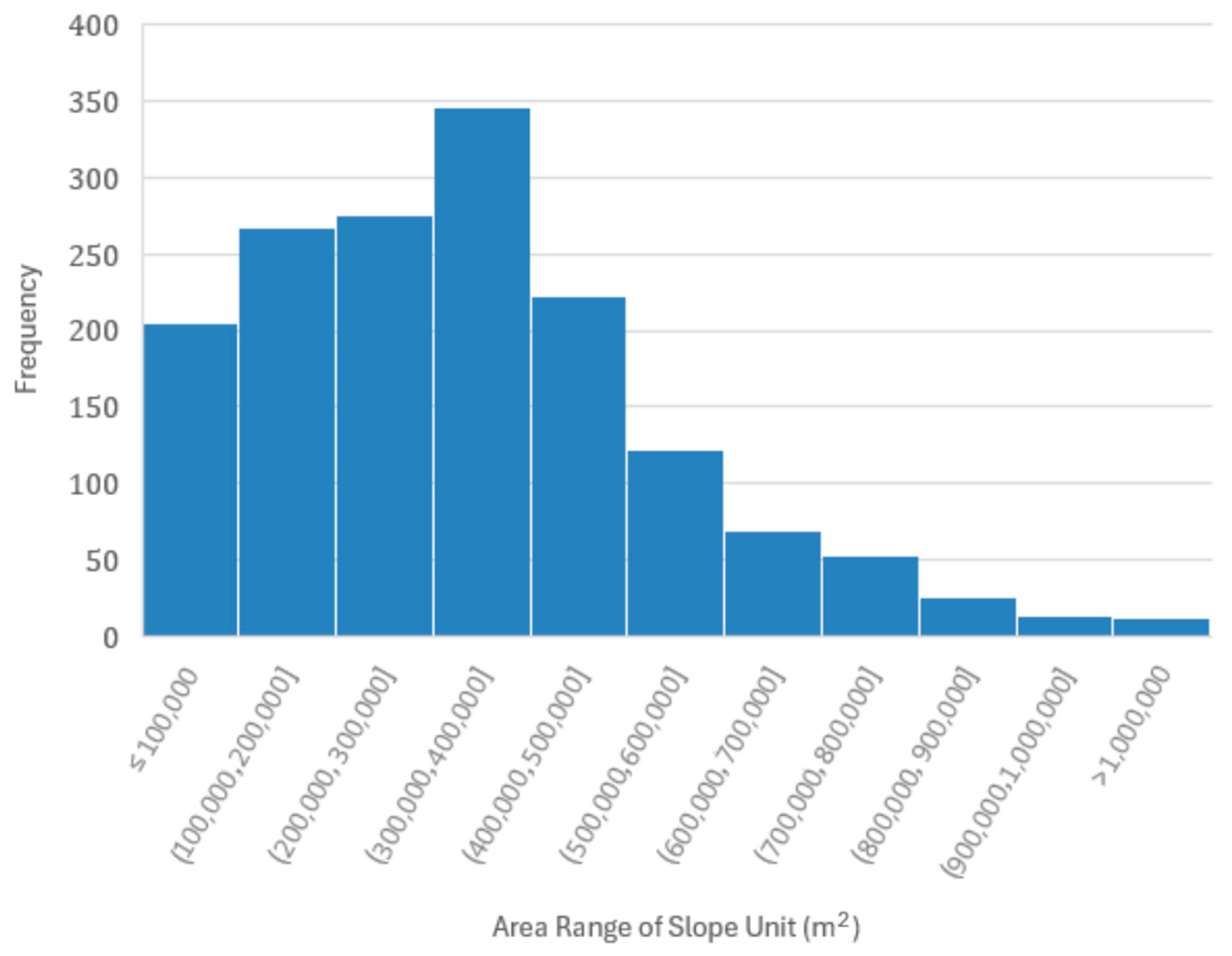 - Slope Height is estimated as the difference between the maximum and minimum elevations in each slope unit (). This is a metric that is particularly useful in assessing landslide magnitude [46].